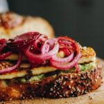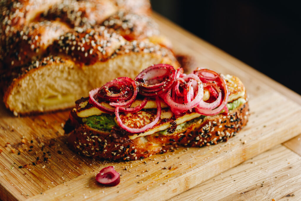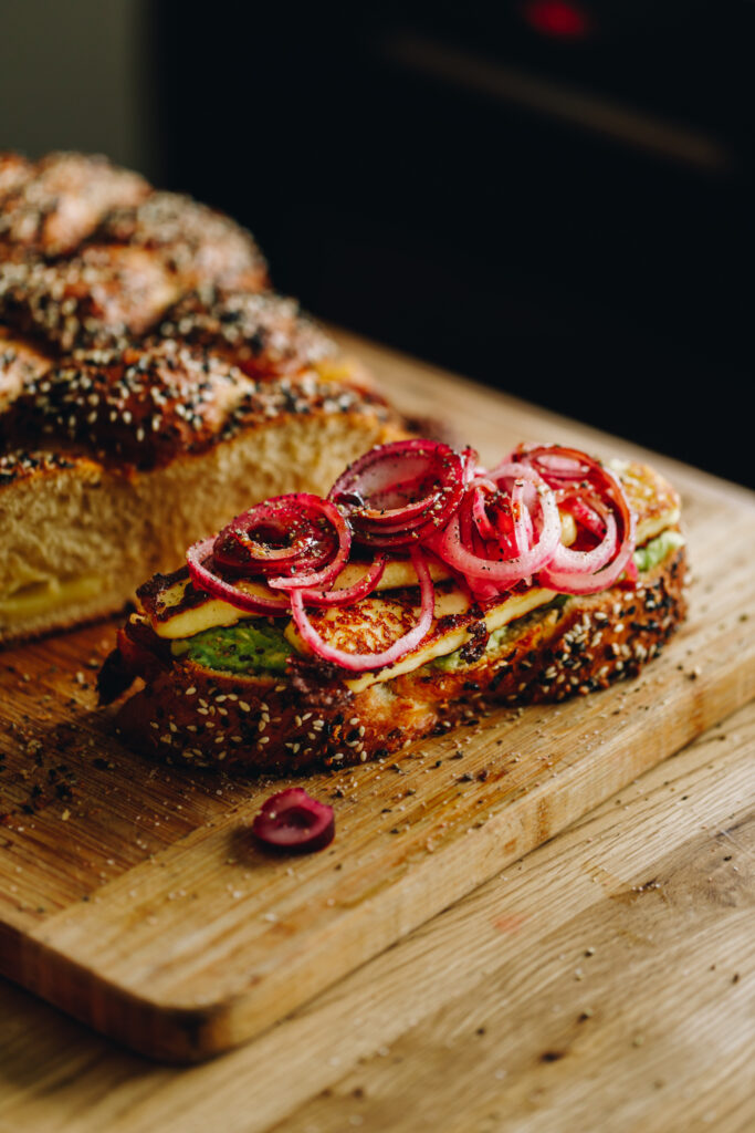 A delicious sandwich with homemade bread, fresh avocado spread, crispy halloumi and speedy pickled onions. The perfect brunch for any occasion.