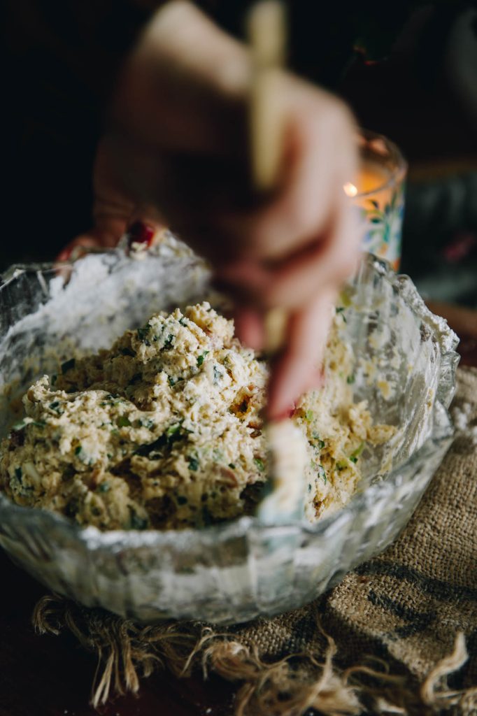 • If you are using the kīnaki (chutney), make a hole in each one with a teaspoon. Fill it with a small teaspoon of kīnaki (chutney) and top it with a little extra tīhi (cheese).