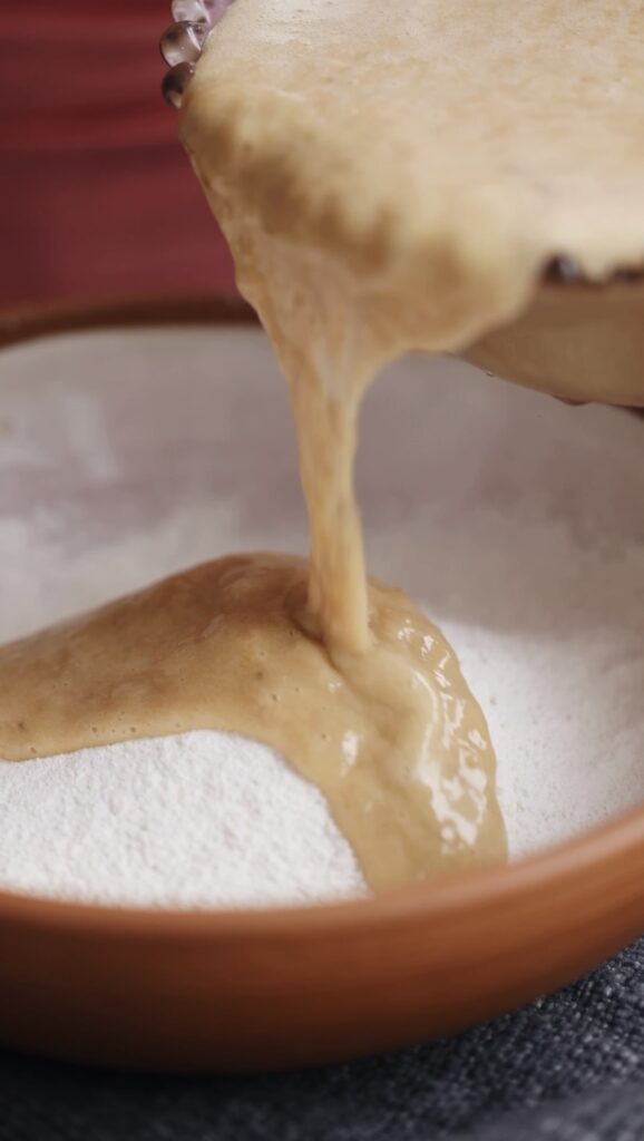 - Once sifted, pour all of the ranunga maika (banana mixture) into the dry ingredients. Using a spatula, gently fold it all together until everything is combined.
