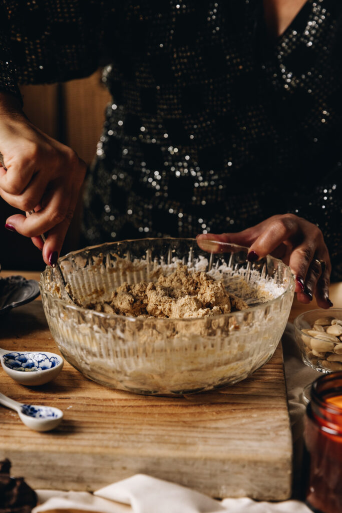 - Add the pata kūteretere (softened butter), pata aramona (almond butter or nut butter), huka one (caster sugar) and wanira (vanilla) to a large bowl. Whip it on high for around 5 minutes until light and fluffy.