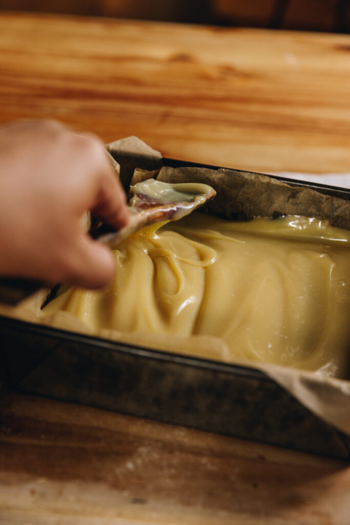 - Over low heat melt all the ingredients together. As soon as everything is melted, pour it on to the base and smooth it out.