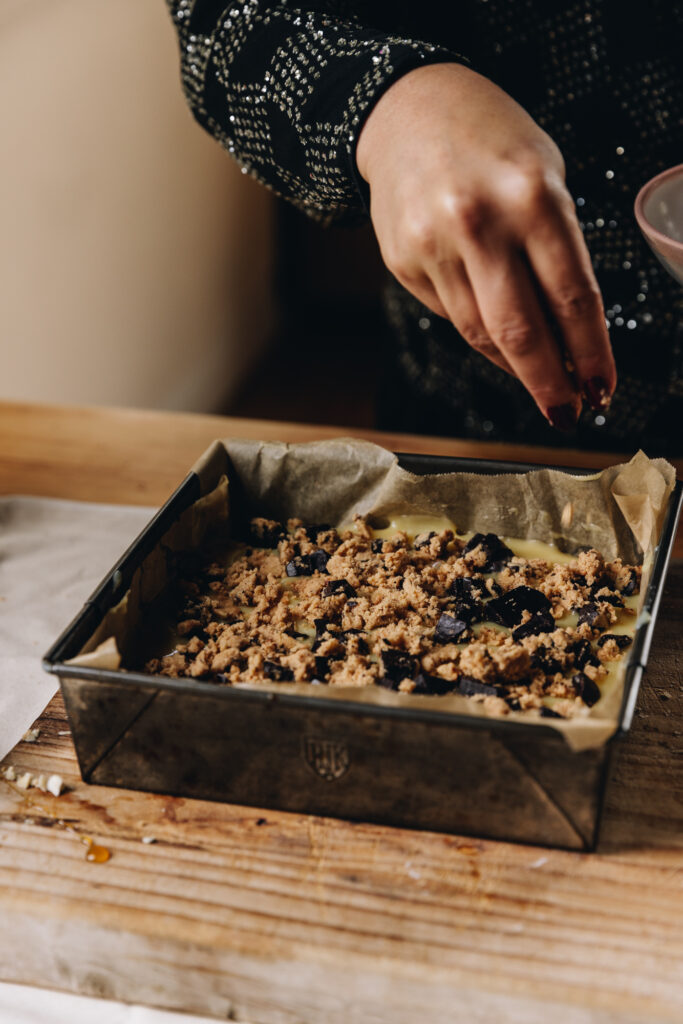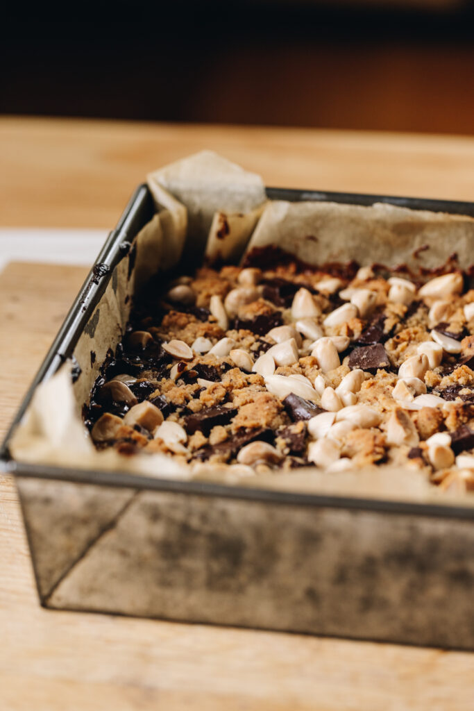 - Sprinkle this crumb all over the caramel. Bake in the oven for 25 minutes until golden and lush! Leave to cool for 15 minutes or so before slicing.