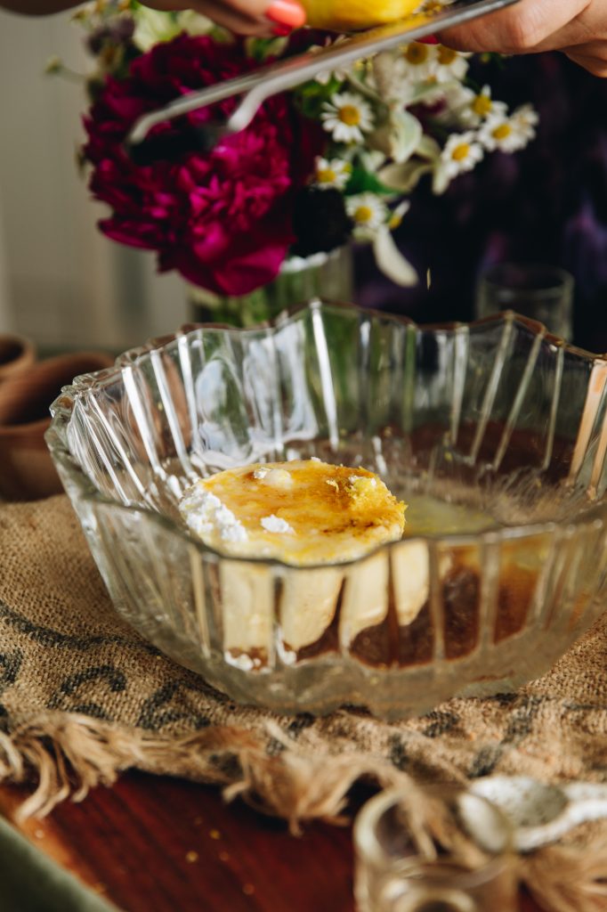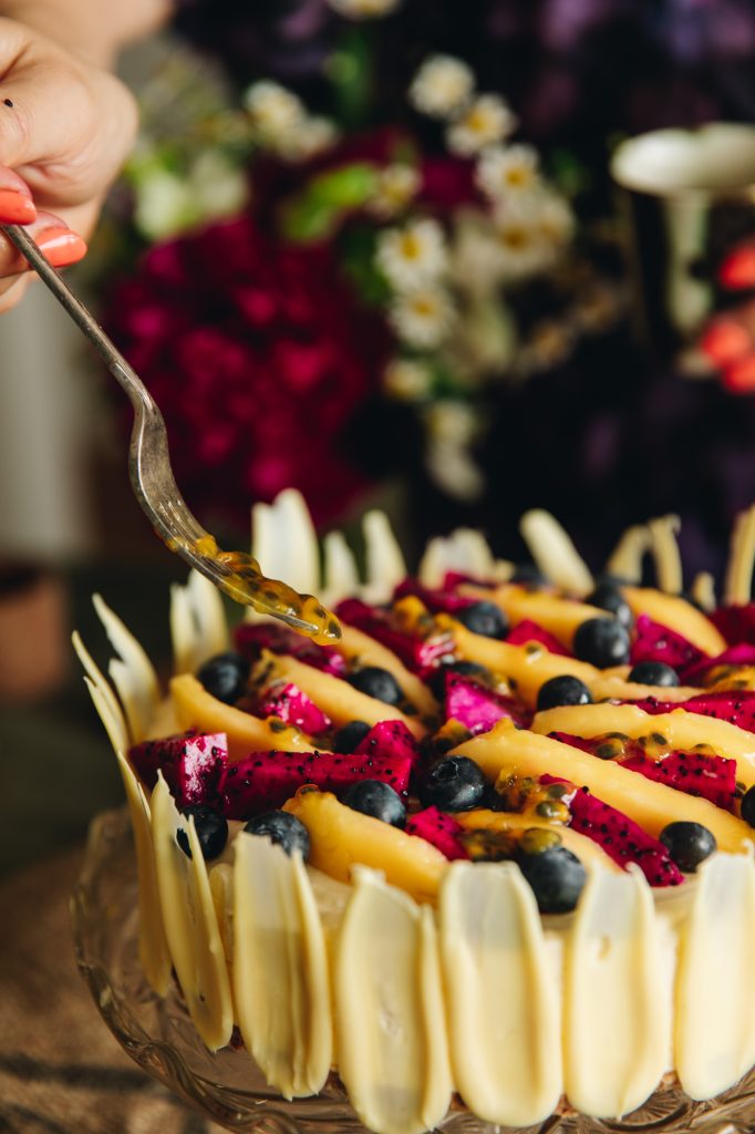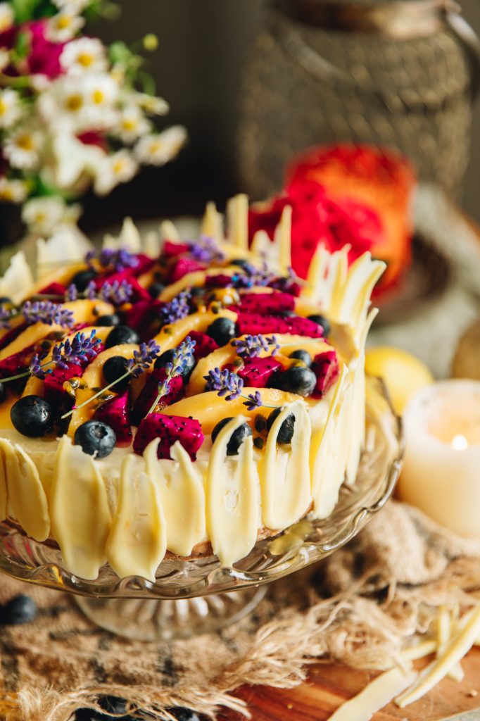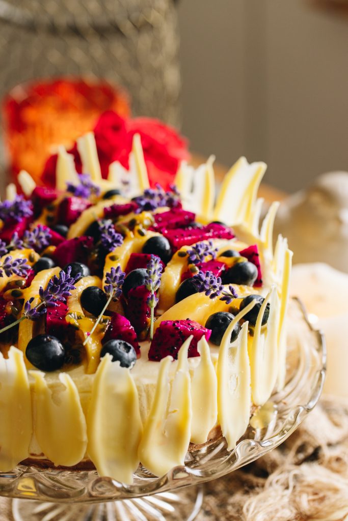 - Sprinkle the tūrutu (blueberries) in to the gaps and drizzle over the wairanu kōhia (passionfruit syrup). Finish with the lavender flowers. Serve to your manuhiri (guests) and be proud of your mahi (work)!