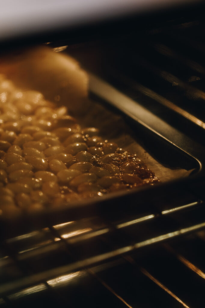 - Line a baking tray with baking paper. Add the aramona (almonds), marahihi māpere (maple syrup) and tote (salt). Mix them all together so all the aramona (almonds) are coated well.