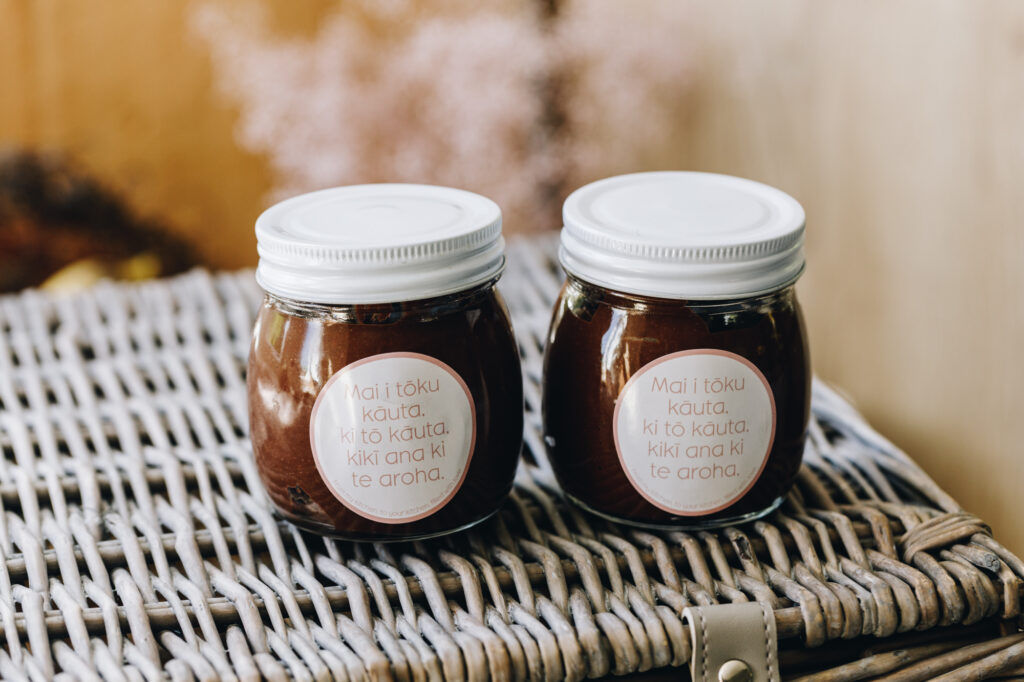 You can leave the pata aramona (almond butter) plain like that or join me on the road to making it into a chocolate version. This is created by adding tiakarete parauri (dark chocolate), wanira (vanilla), kōkō (cocoa) and puehu huka (icing sugar) to the nut butter. It is whizzed together and then jarred, ready to spread on my spiced banana loaf, toast or straight from the spoon.