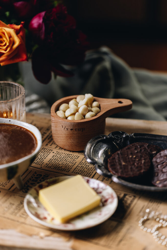 These little purini (desserts) hit the spot every time. They are perfect for a dinner party, Christmas dessert, or for any reason at all. We start with a super simple crumb made of nati makatāmia (macadamia nuts) and pihikete wīti (wheat biscuits). You can swap out the biscuits for your favourite and delete the nuts if you don’t want to use them. The main layer is a creamy chocolate mousse that melts in the mouth. Make sure you use a good quality tiakarete (chocolate) for the mousse as it really does make a difference to the final product. We top these bad boys off with a deep flavoured, homemade karamea tote (salted caramel). Te mutunga mai o te reka – absolutely delicious. Me mahi purini tiakarete tātou – let’s make some chocolate mousse!