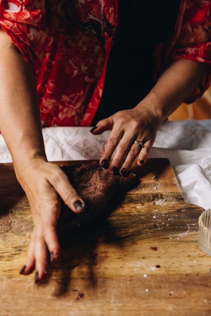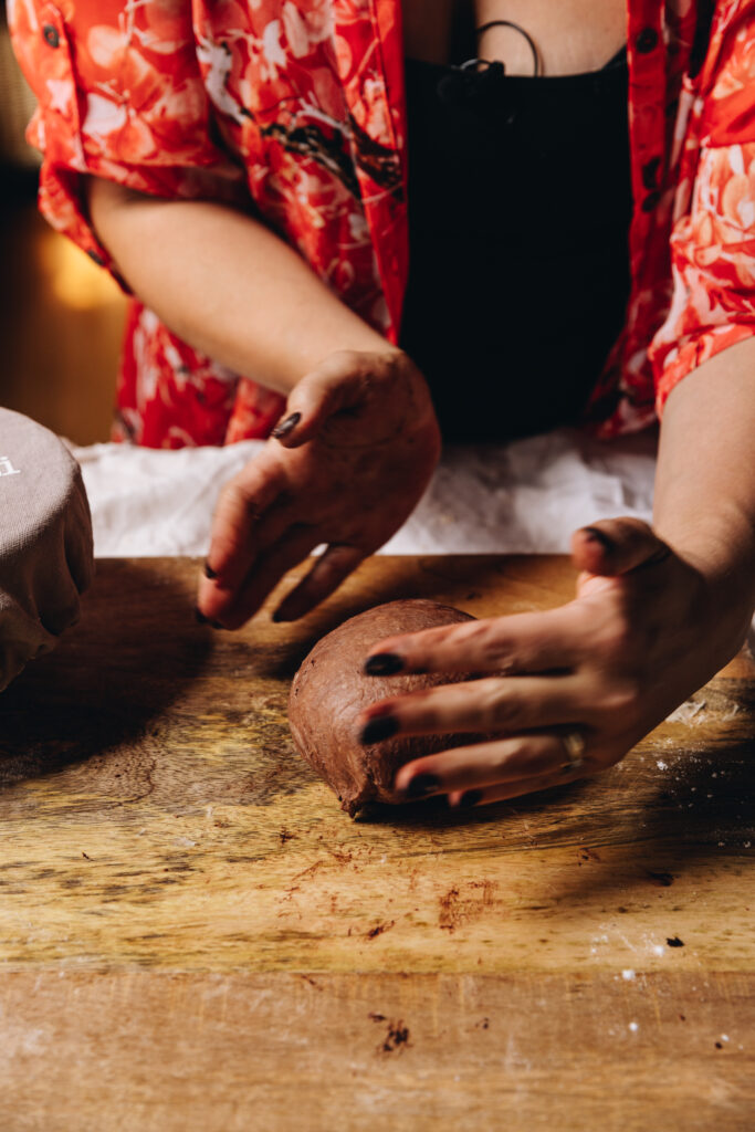 - Spread out the second piece of dough in to a rectangle. Spread the pē kōkō (cocoa paste) on to it. Knead it gently for a few minutes until it is all mixed through, it should not need more flour.