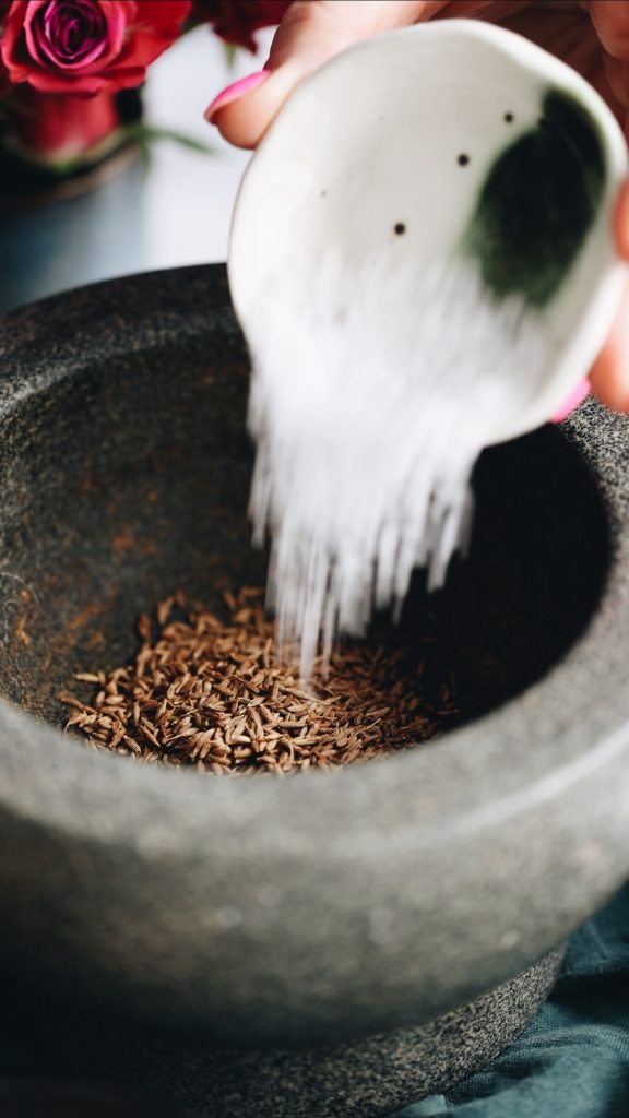 - Add the tote (salt) to the kākano kumene (cumin seeds) and either grind them to a powder with a mortar and pestle or crush and chop them finely with a sharp knife. This can also be ground in a spice grinder.