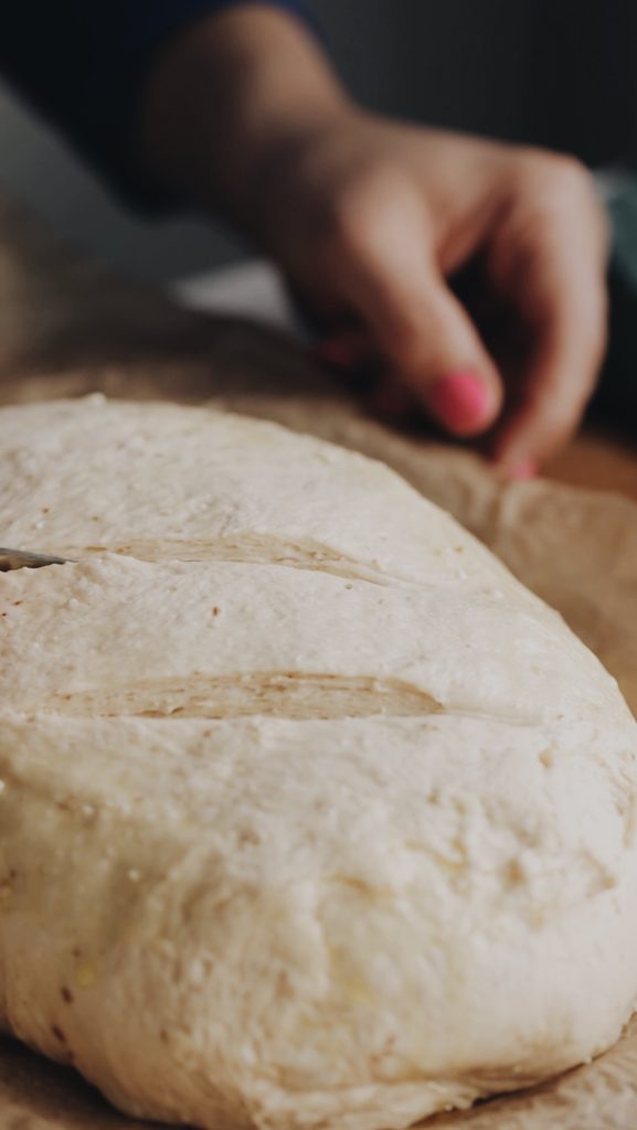 - Once it has doubled in size, score it, this helps the parāoa (bread) rise in a uniform way and can be done with scissors or a sharp knife. Slide it in to the pre-heated oven and bake for 45 minutes until golden.