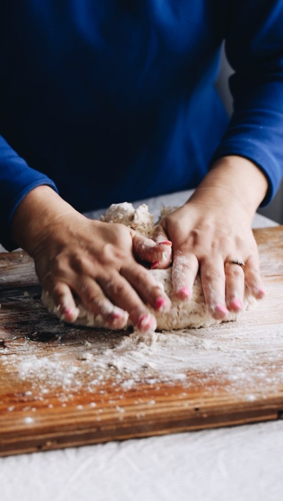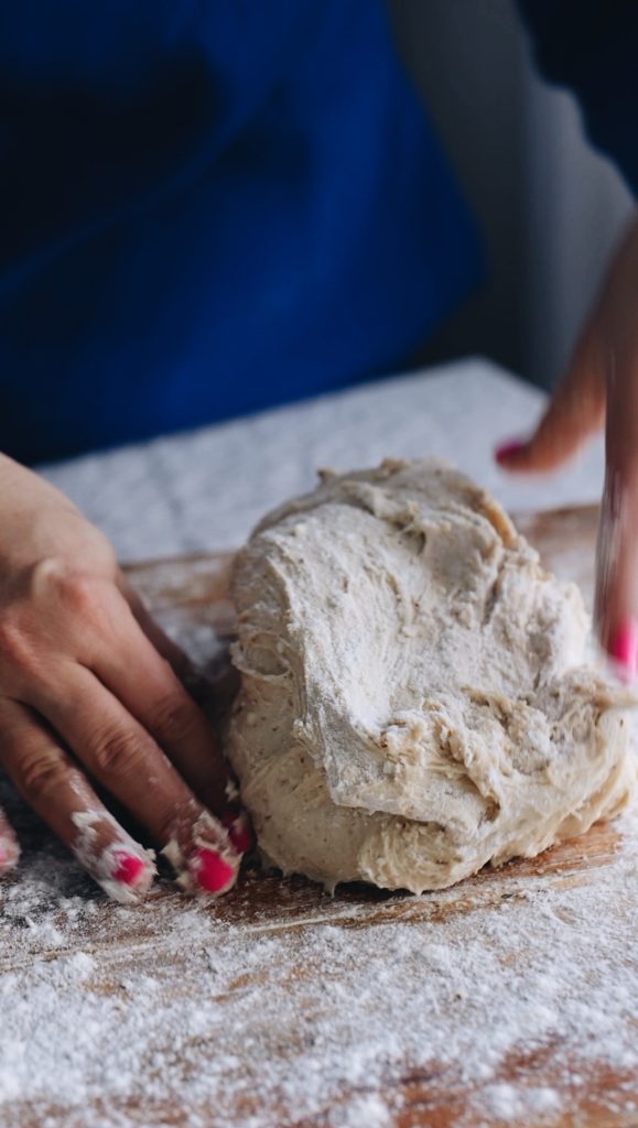 - Once the dough has risen, tip it on to a lightly floured bench and fold in to a loaf shape. (Refer to the video for a guide).