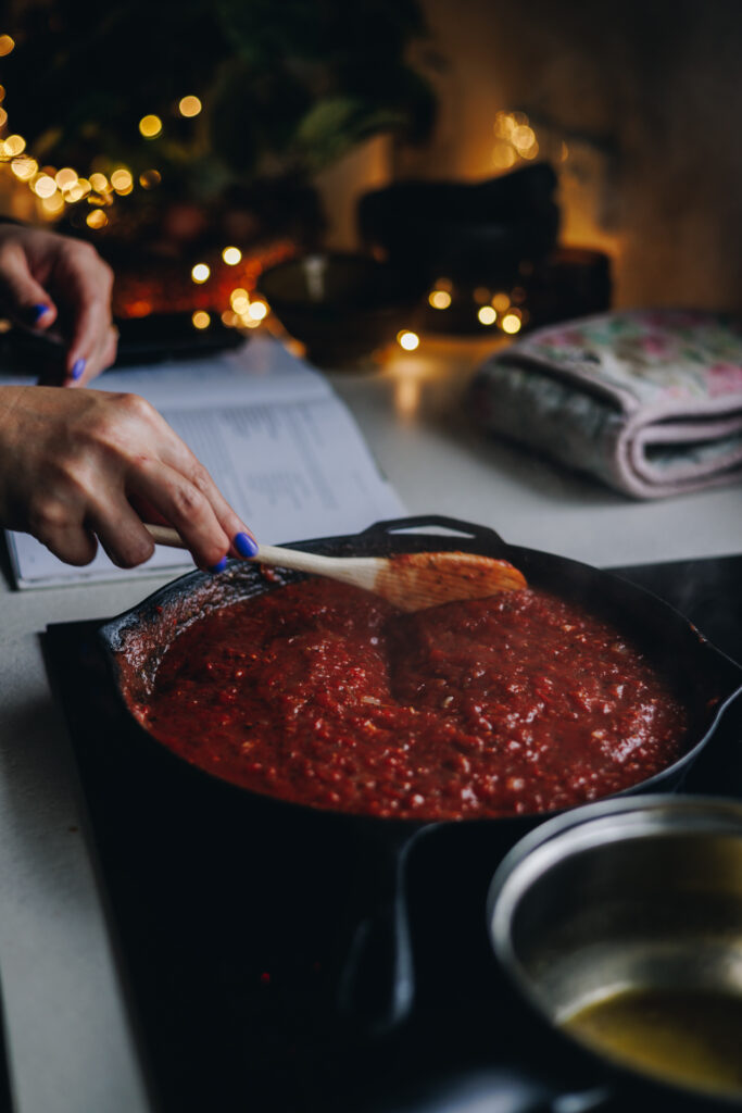 - Add in the tōmato (tomatoes). Stir, turn down the heat and simmer on low for 15 minutes. Stir occasionally. It is done when it has thickened and has a jammy appearance. The consistency is up to you.