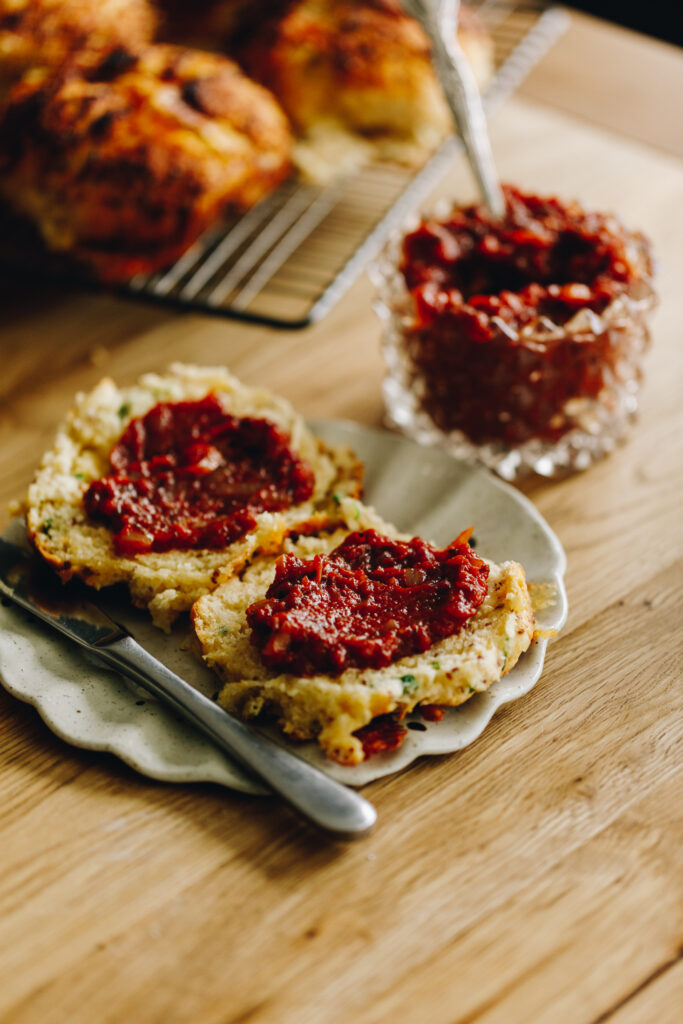 I love homemade kīnaki (chutney). Many of the store brought ones are often so filled with sugar that it seems to be the only flavour you can taste. This simple recipe is from my cookbook. It uses simple ingredients that many of us have in our pātaka kai (pantry) already. This is perfect for folding through parāoa rimurapa (pasta), adding in to hanawiti (sandwhiches), spreading on to parehe (pizza) and serving alongside my Brie Stuffed Scones with Honey Mustard.