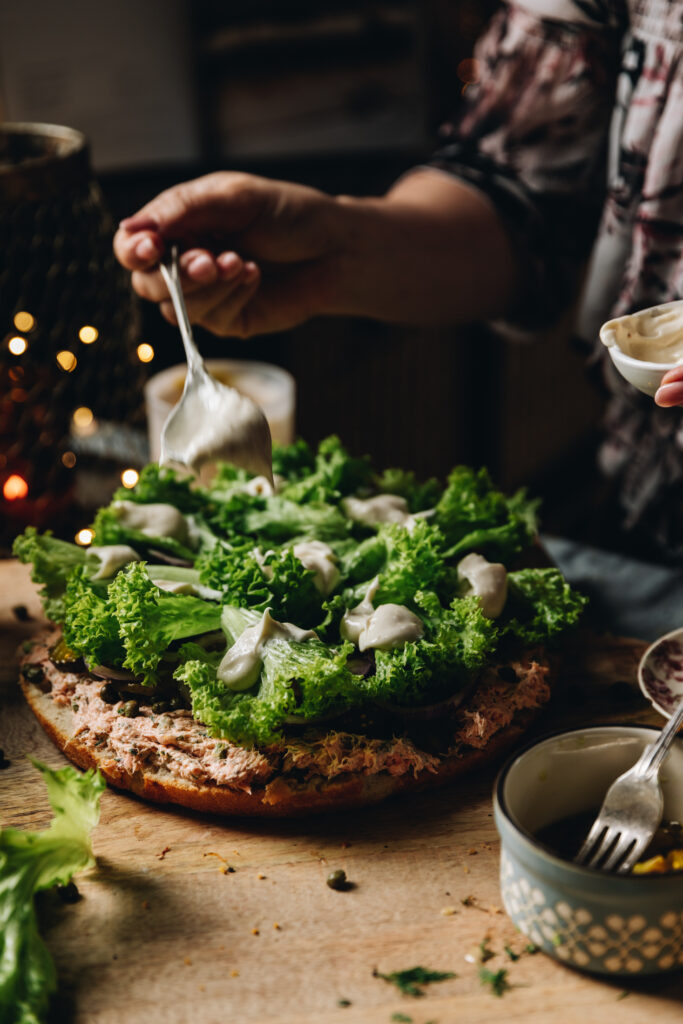 A delicious sandwich to feed a crowd with salmon spread and fresh ingredients.