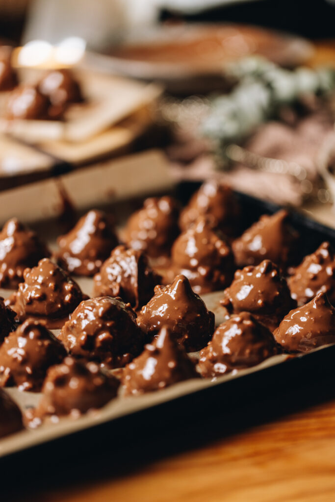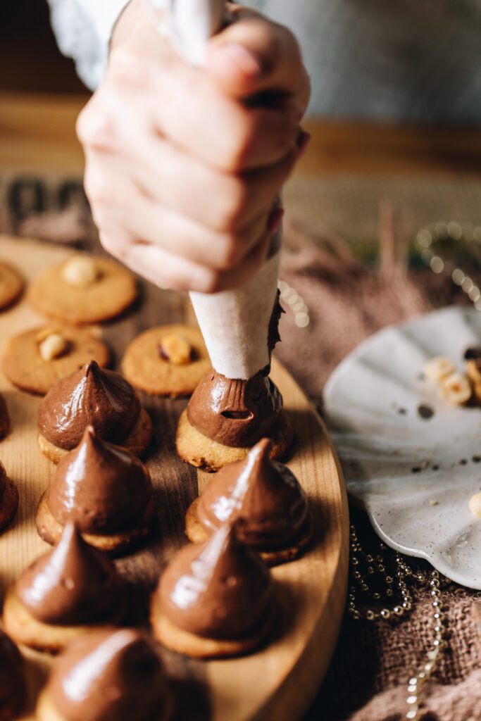Everyone loves Forrero Rocher, oh yes they do! The perfect little truffle of creamy hazelnut chocolate with a crispy wafer and toasted hazelnuts. A little tricky to replicate at home but if we take those amazing flavours and turn them in to a pihikete (biscuit)….we have a magical moment! We make a simple roasted hazelnut cookie dough and bake them until golden. We top them with another hānati (hazelnut) and Nutella chocolate cream. To finish them, they are dunked in to tiakarete hānati (hazelnut chocolate). These are such a beautiful treat for Kirihimete (Christmas) or a dinner party. They would also be an amazing gift, wrapped in brown paper and tied up with string! Me tunu kai tātou – let’s bake!
