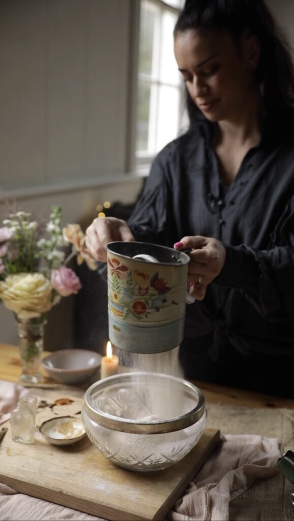 - Into a large bowl, sift the puehu parāoa whakatipu (self-raising flour), paura tinitia (ginger powder), rau kikini whakauruuru (mixed spice) and pēkana houra (baking soda).