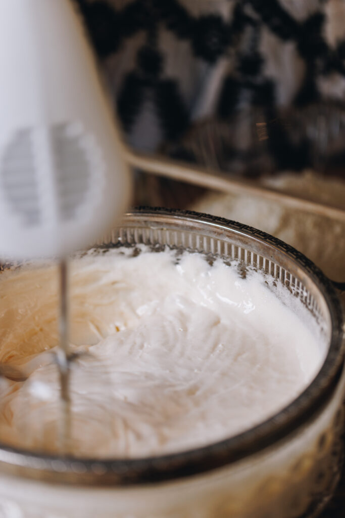 - In to a third bowl (sorry for this many bowls), add the hēki (eggs) and huka one (caster sugar). Whip on high for 5 to 7 minutes until light in colour and fluffy.