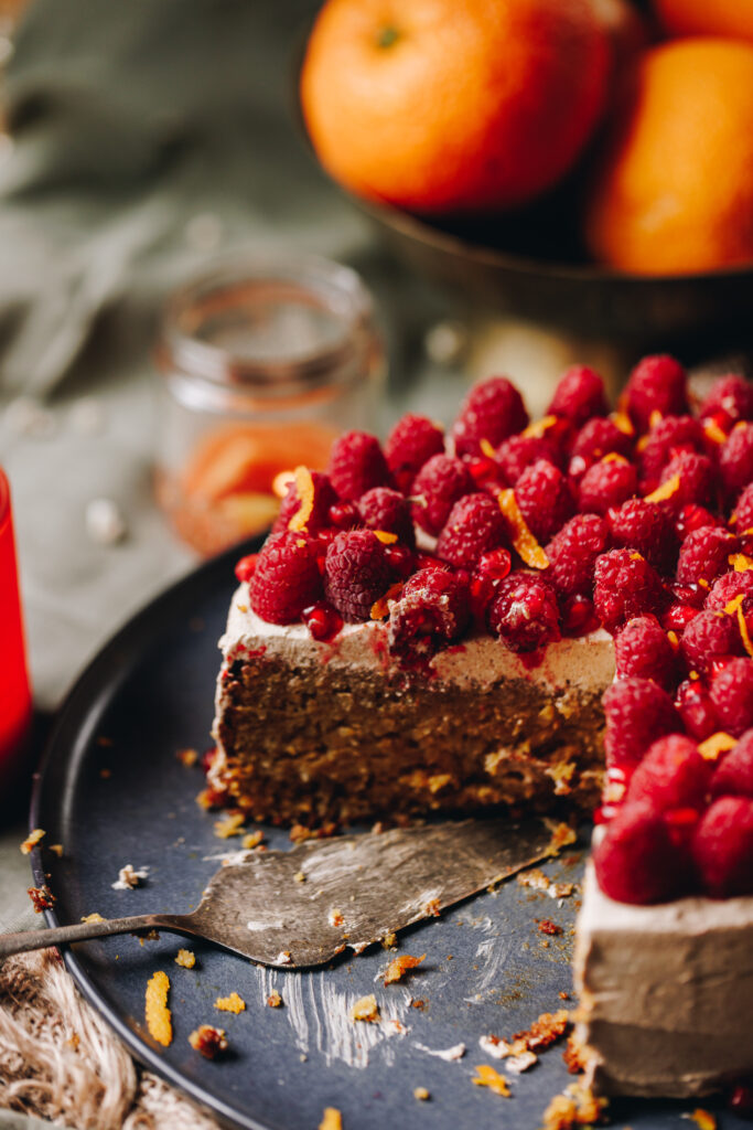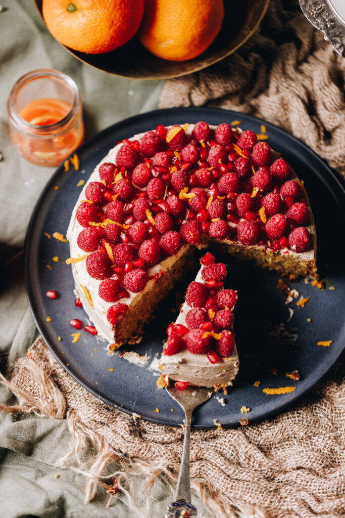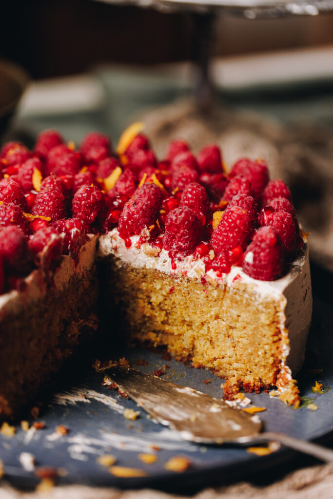 - Once the cake is cool smear it with my simple cinnamon icing. Now arrange the rahipere (raspberries) on top. Sprinkle over kākano pamakaranete (pomegranate seeds) and grate over the kiri ārani (orange zest). Serve and enjoy.