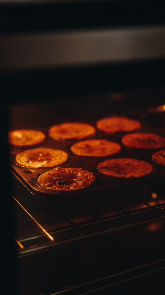 - Divide the remaining ⅓ of the mixture in to 12 pieces to create the lids. Spread out each piece and press it firmly on the top and down the sides of the tin.