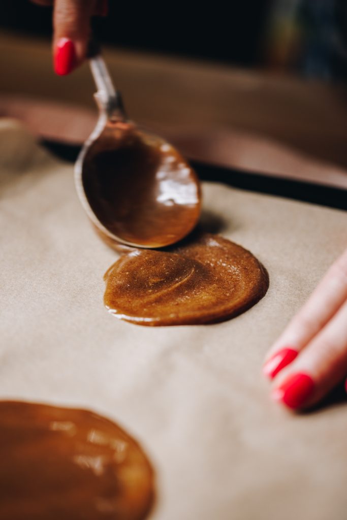 - Remove from the oven and leave for 1 – 2 minutes to cool but not longer as they will start to harden.If your baking tray has sides like mine does, transfer the baking paper with the cooked mixture on to a large chopping board or the bench for ease of rolling.