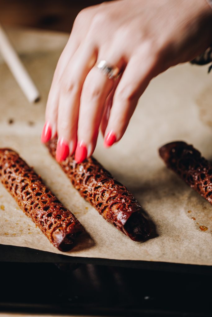 - Note: If some of the biscuits cool down too fast hard and go hard as you are rolling them, no worries, just return any that have gone hard to the tray and cook again in the oven for 45 seconds to a minute to soften them again. Pull them back out and roll them in to the cylinders.