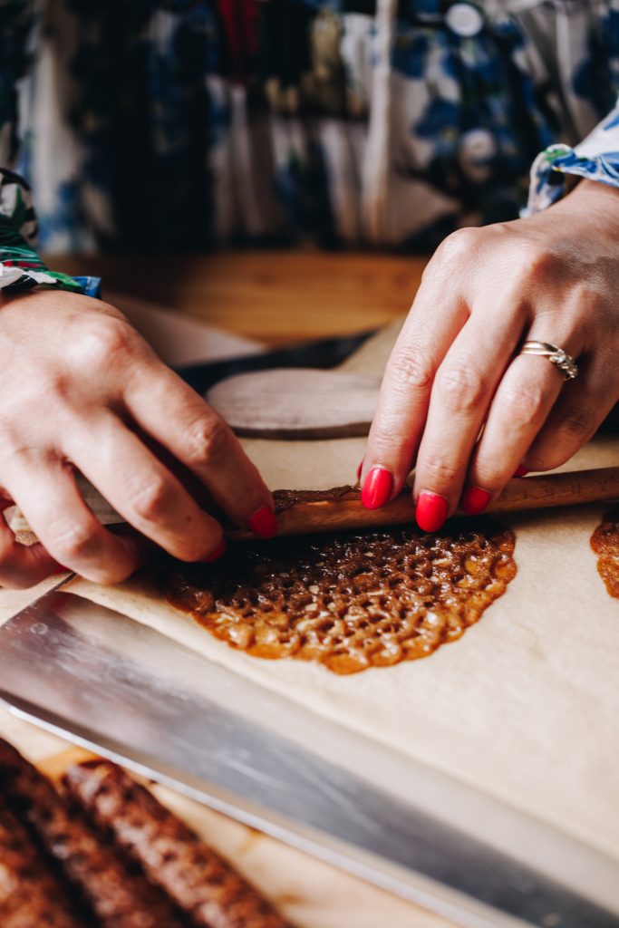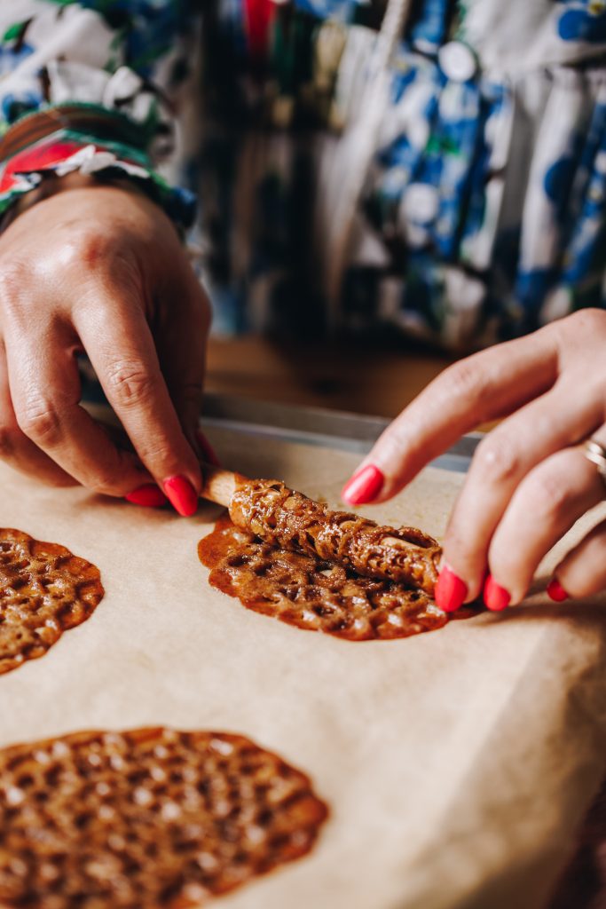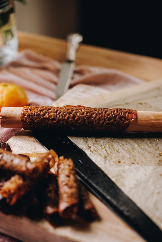 - Once the pihikete parani (brandy snaps) have been filled with the kirīmi (cream), store them in the fridge for up to 8 hours on a tray. Any longer than that and they will start to loose their crunch. Grate over a touch of kiri ārani (orange zest) before serving for a pop of fresh.