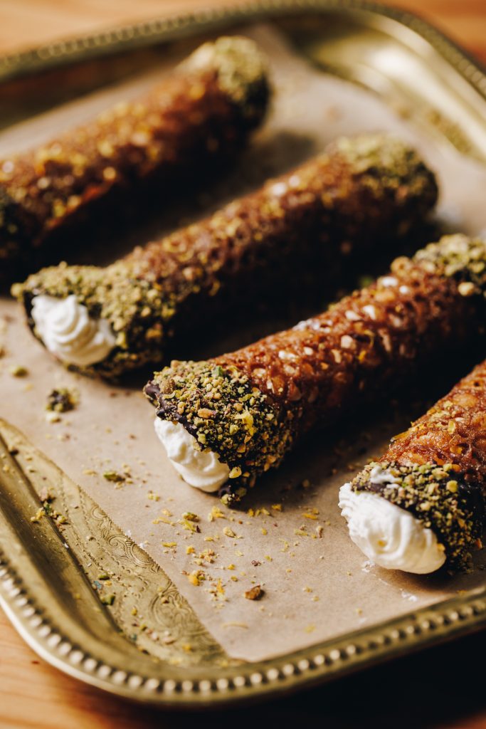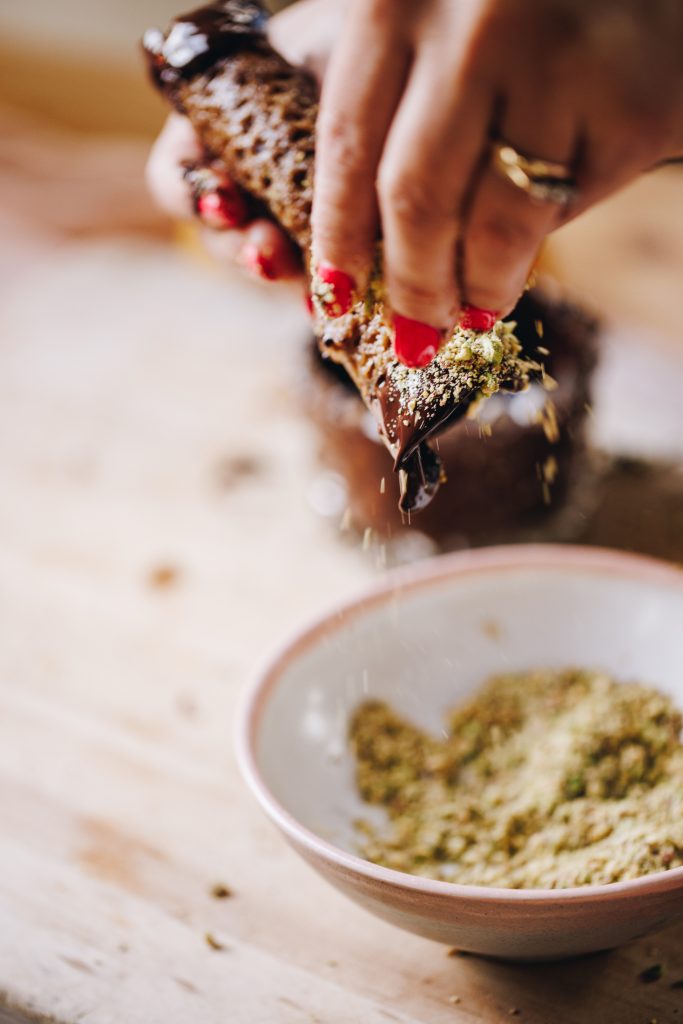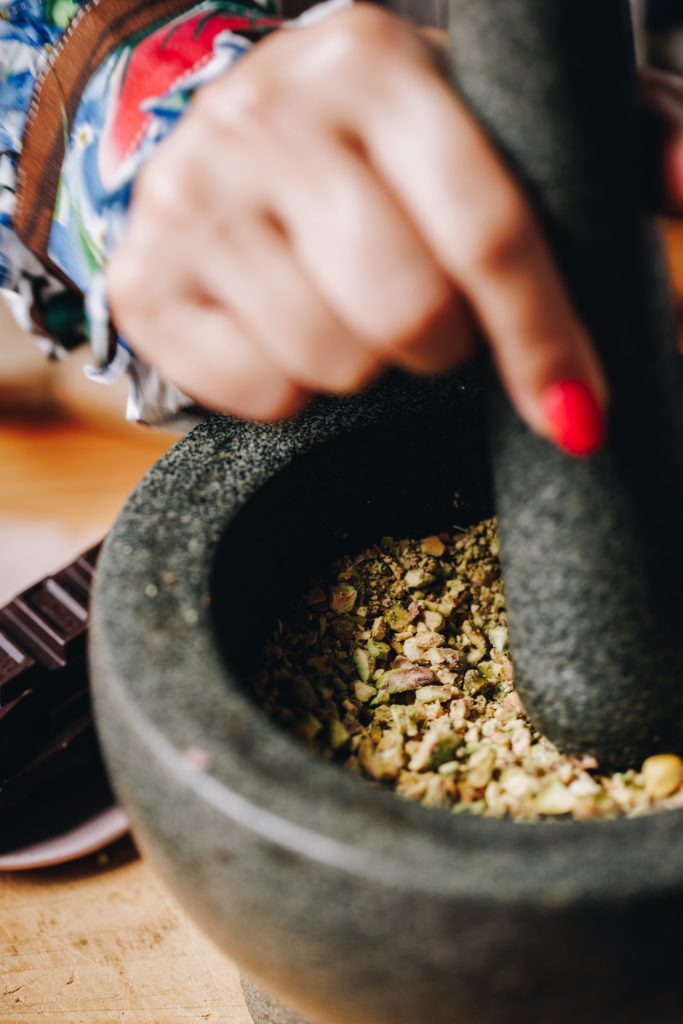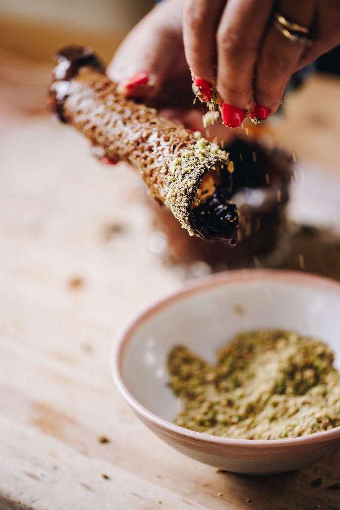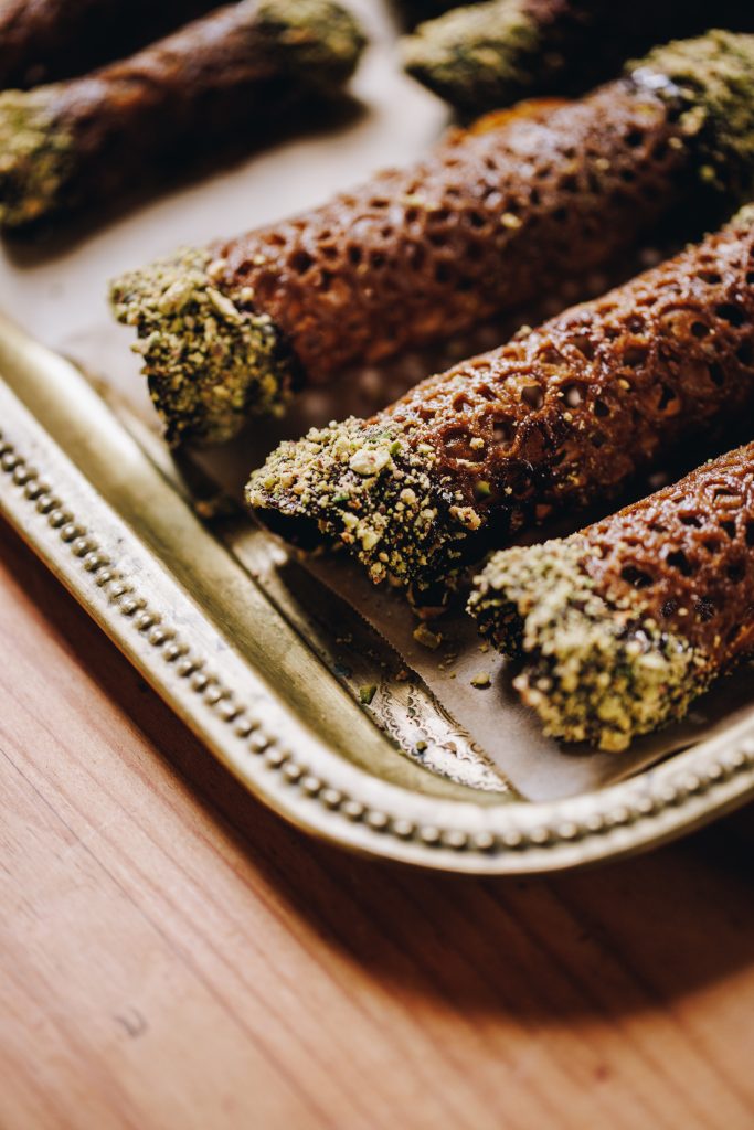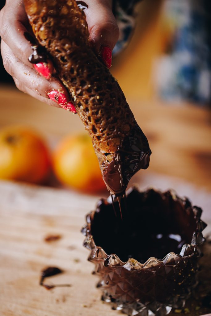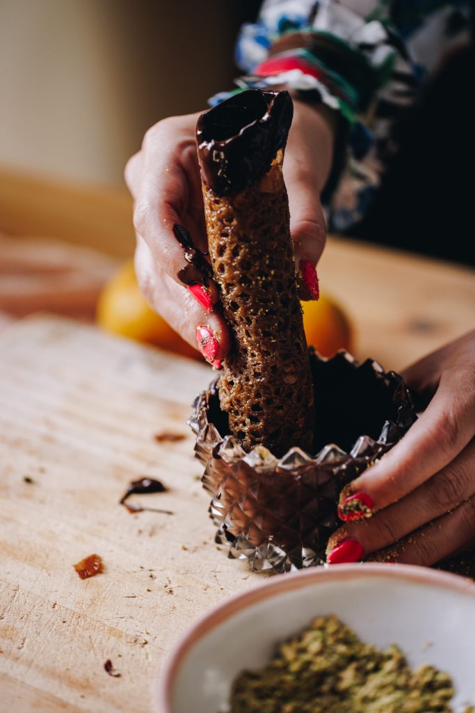 - Melt the tiakarete parauri (dark chocolate). Dip each pihikete parani (brandy snaps) in to the melted chocolate on both ends. Shake off the excess and sprinkle over the crushed pihitāhio (pistachios). Allow to set in the fridge for ten minutes.