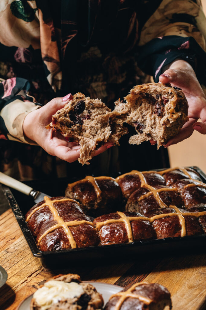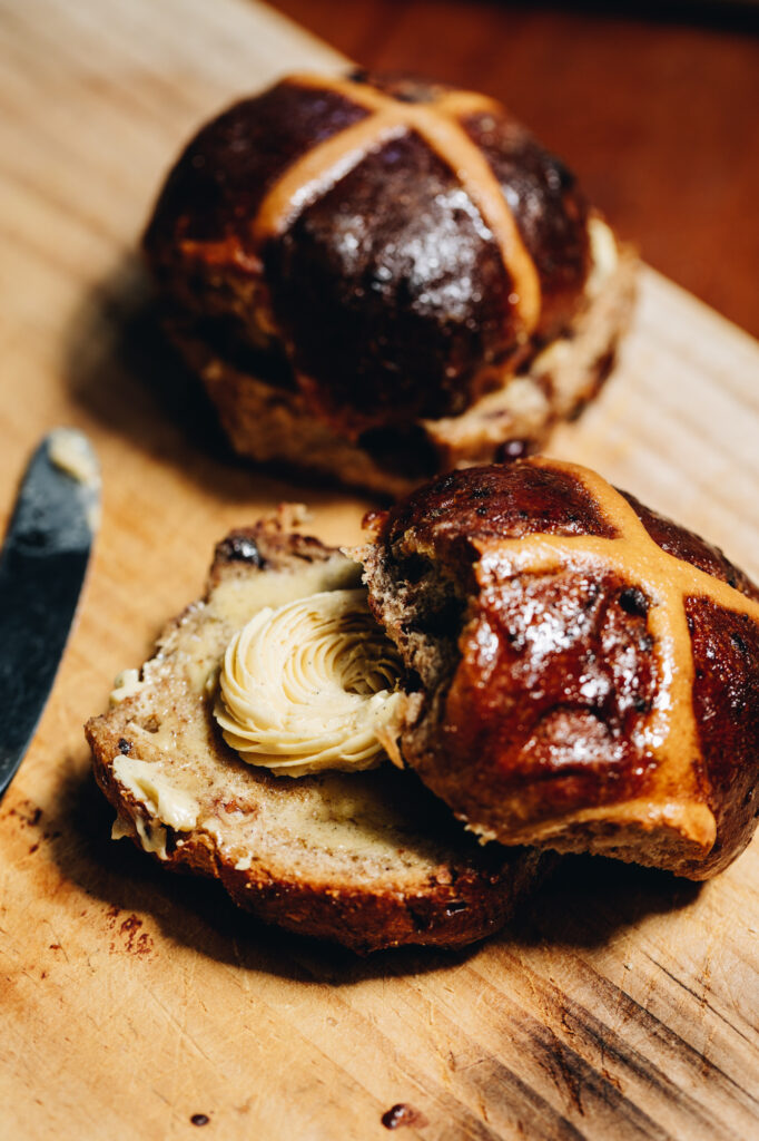 This another recipe from my cookbook and I thought it would be good to split the recipe in to two so you can make it the way you want to. Why make an overnight version of hot cross buns? Well, making this dough overnight deepens the flavour in a way you can never achieve when making it the same day. It also means much easier handling when you are manipulating the dough in to buns. Make the dough, let it rise for an hour on the bench and then do the remainder of the bulk rise in the fridge overnight. The next day roll it in to buns, pipe the crosses on and bake them fresh for those you love, or those who are need of some care. Smear them with Whipped Vanilla Butter for that extra touch.