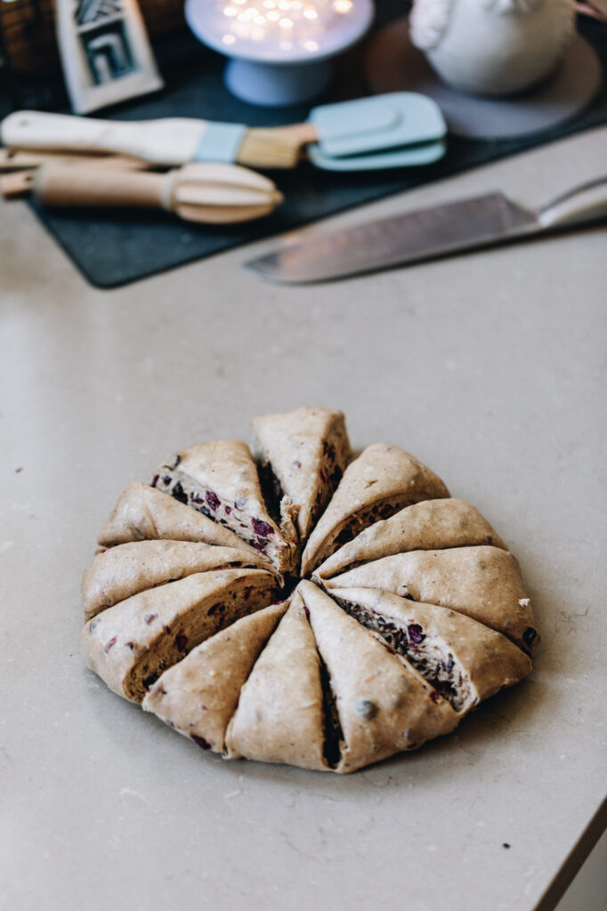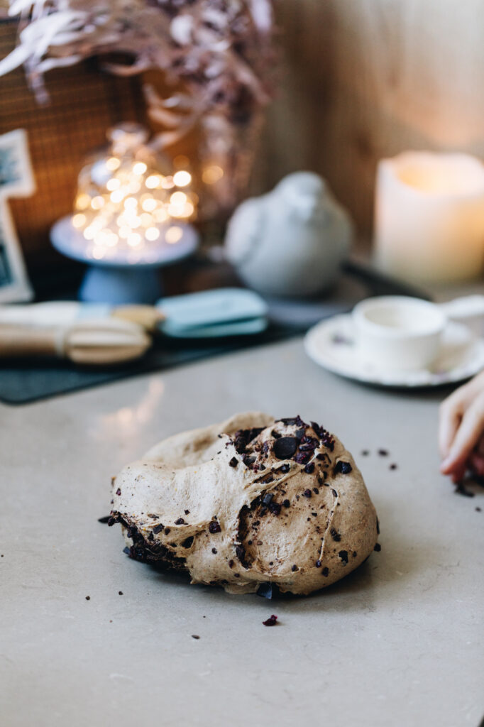 - After the dough has been kneaded well, stretch it out to a rough square. Sprinkle over the tiakarete (chocolate) and karanipere (cranberries), fold it in from the edges and knead it by hand until it is distributed well.