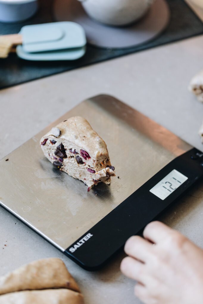 - The next day, tip the dough on to the bench and cut in to 12 equal pieces. The easiest way is to weigh the dough on a scale but you can also eye ball it.