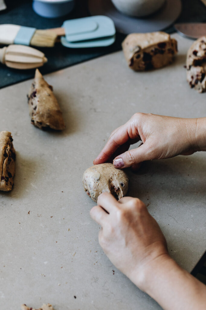 With the overnight version of this recipe, I like to refrain from adding extra flour to the dough as it is cooled down in the fridge overnight. If you do not add extra flour then the buns will be super fluffy the next day. However, if you are hand kneading and the stickiness is wearing you down then you can use up to 1/4 cup of extra flour in this recipe. If you need some extra guidance with kneading then head to this post for a few extra tips on kneading dough.