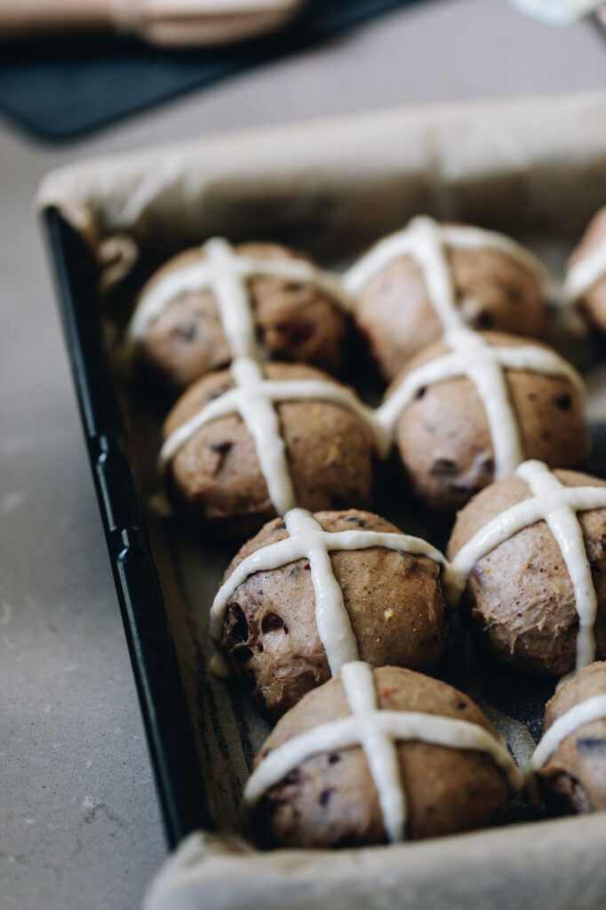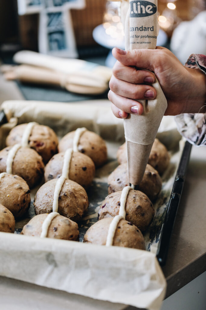 - Add the mixture to a piping bag and pipe the crosses on to the risen buns. Once the rising time is up, slide them in to the oven.