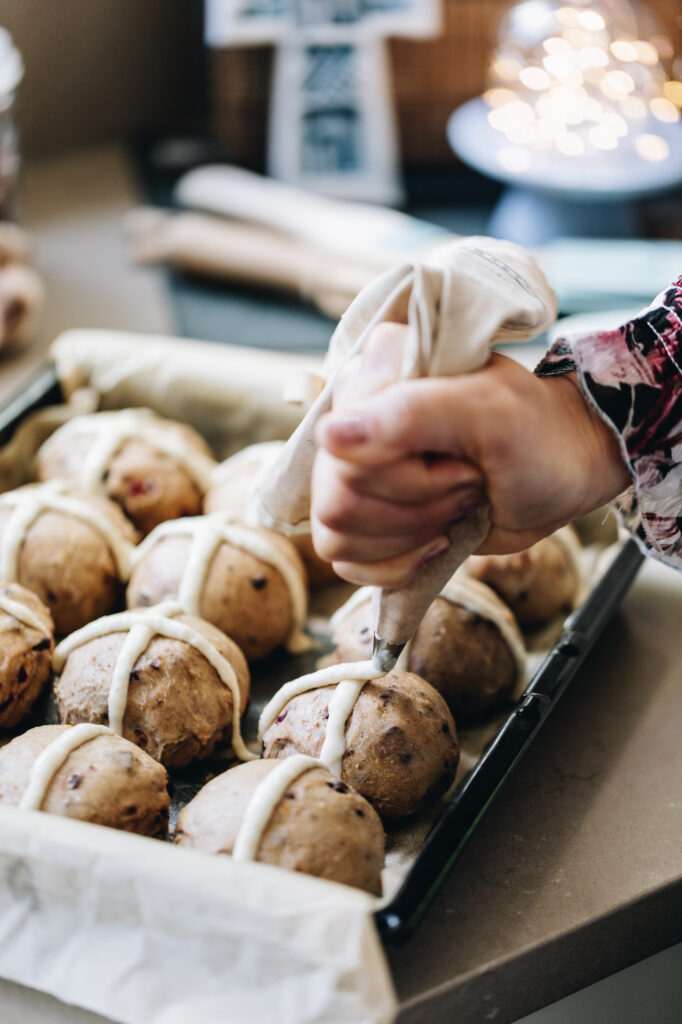 - Add the mixture to a piping bag and pipe the crosses on to the risen buns. Once the rising time is up, slide them in to the oven.