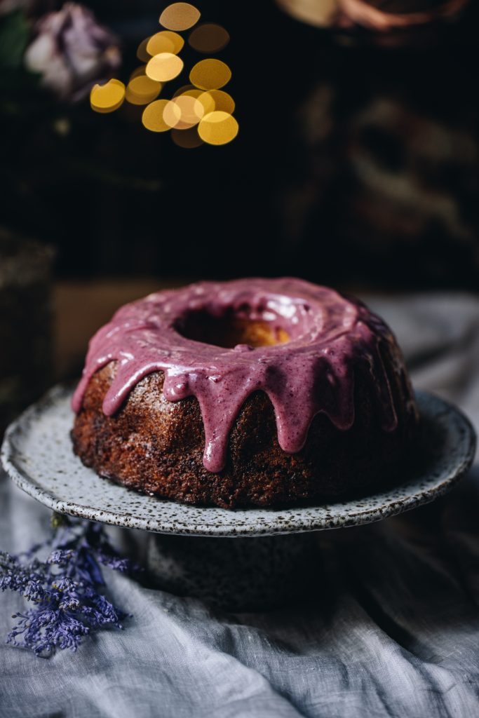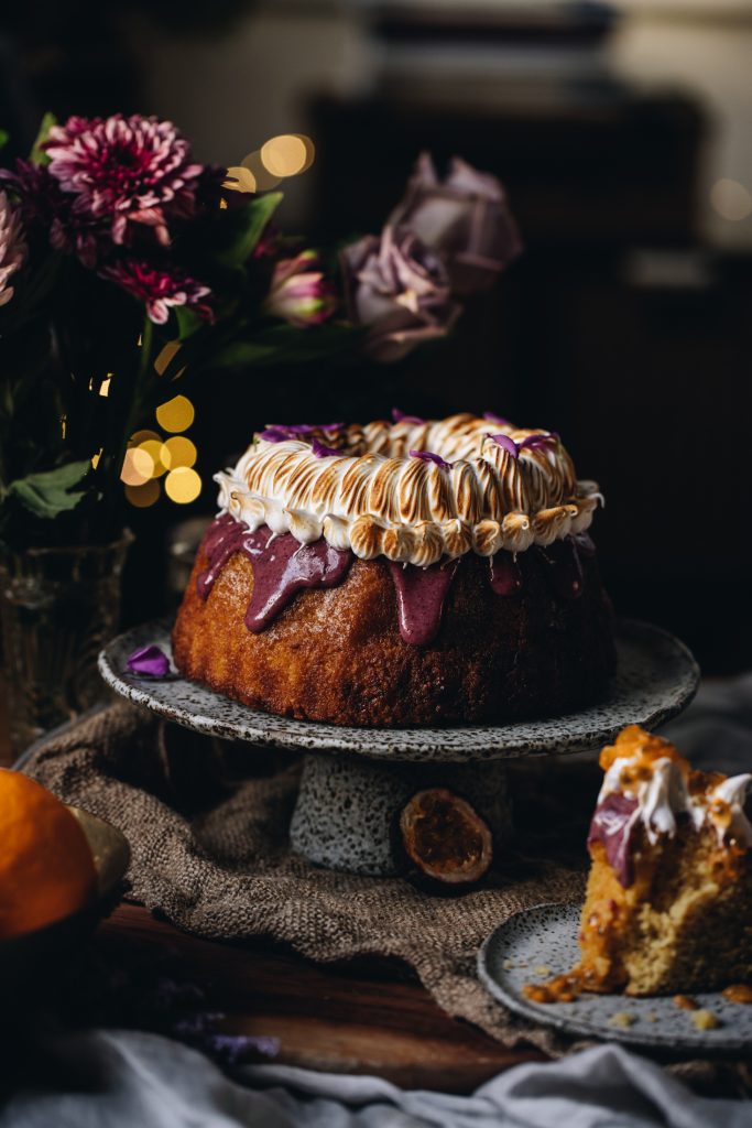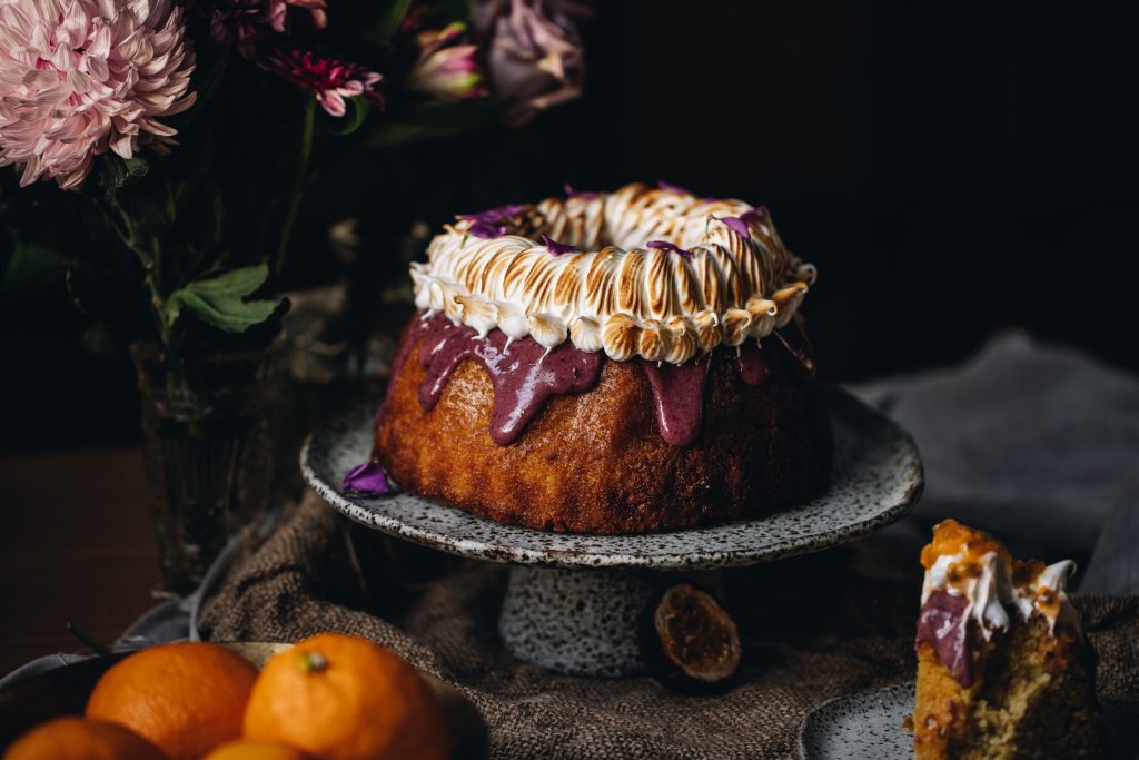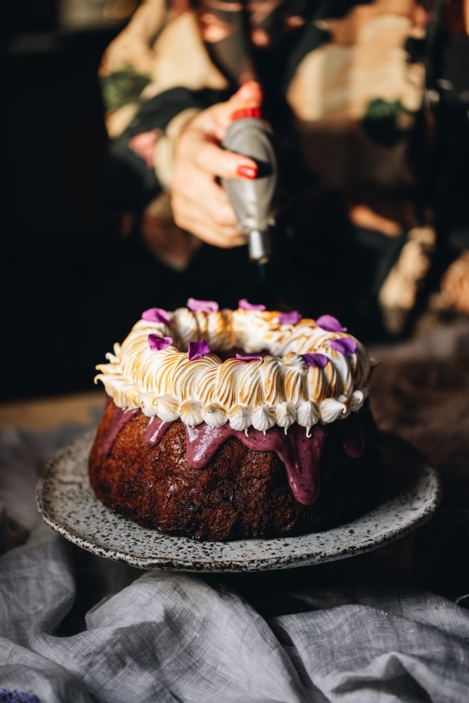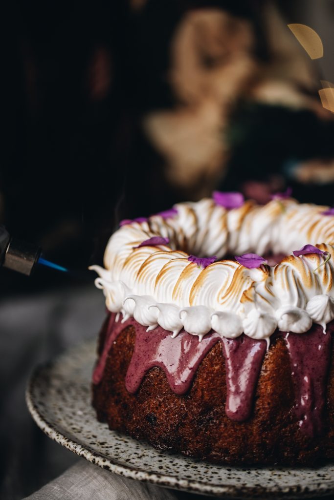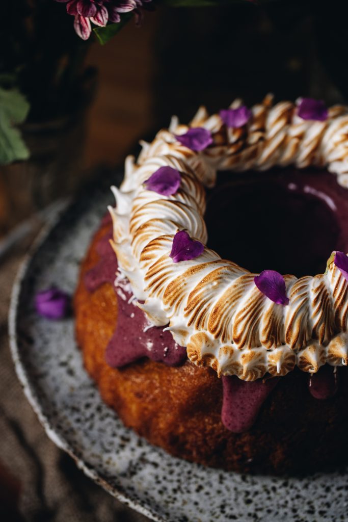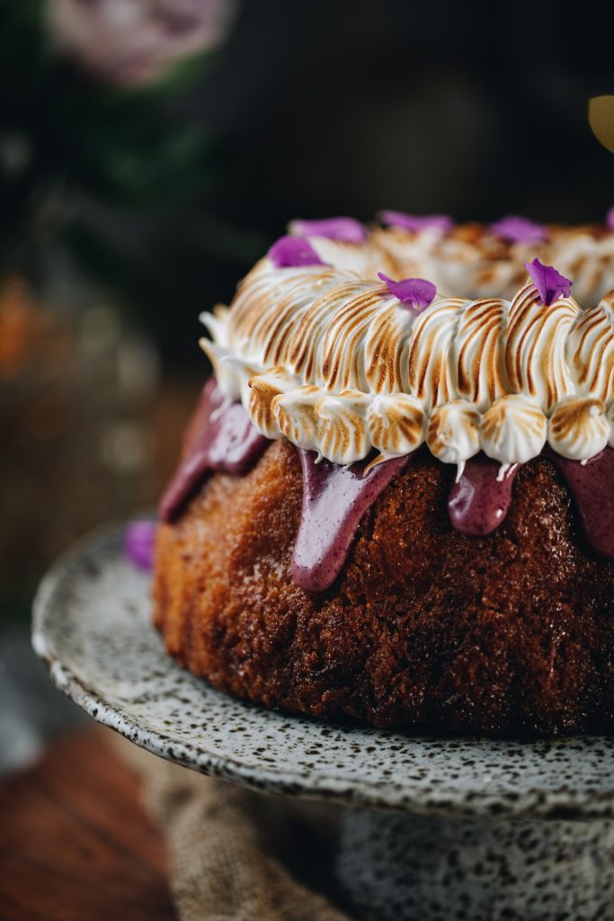 - For the Bundt Cake – Drizzle the kirīmi (ganache) over the keke (cake), gently nudging it over the edges so it falls down nicely. Serve it just like that or you can do what I did and decorate with the tāhungahunga (meringue).