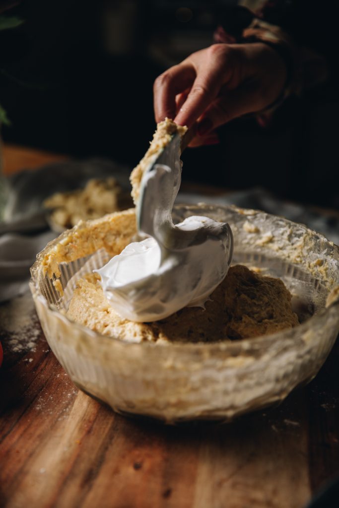- Add the second measure of huka one (caster sugar) to the reserved kahu hēki (egg whites). Whip on medium-high speed until stiff peaks appear. Add a third of the meringue in to the flour mix at a time, folding well after each addition.