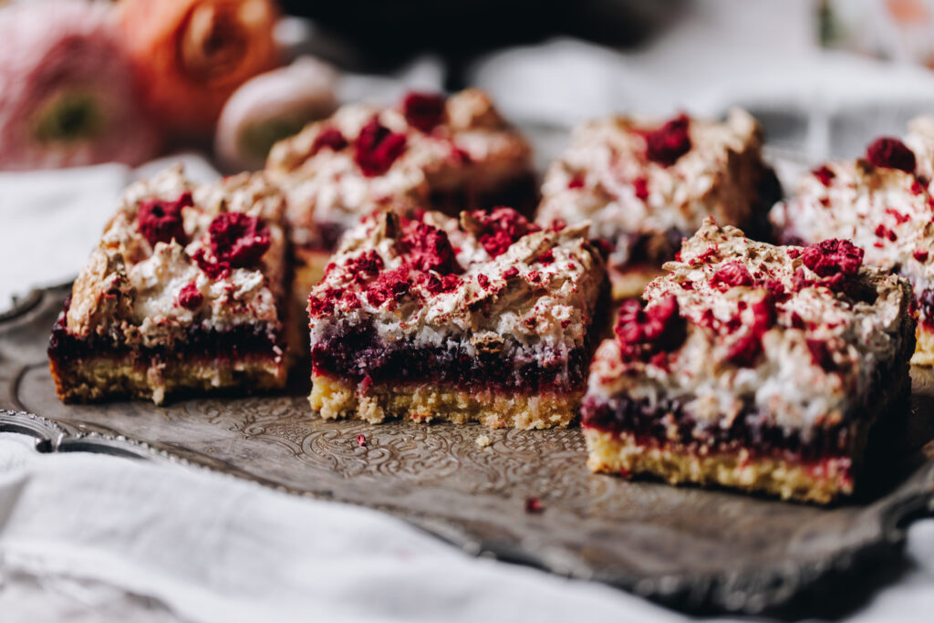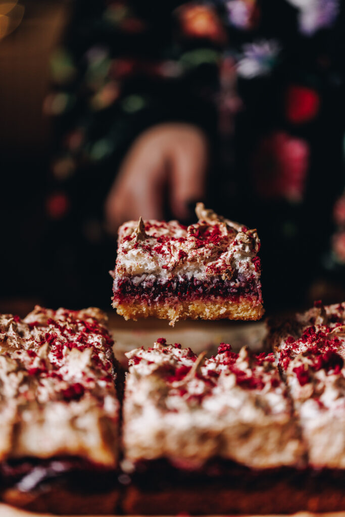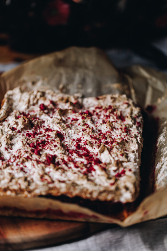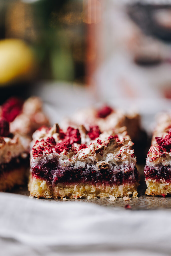 The slice of dreams! A buttery shortbread base, layered with a fresh raspberry chia jam and topped with a coconut Swiss meringue.