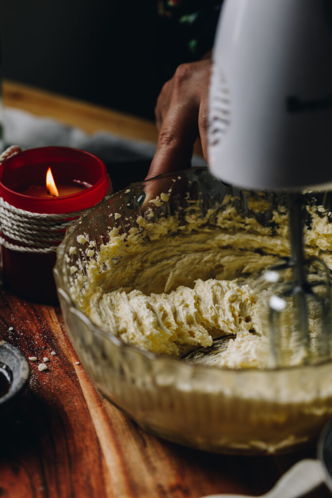 • Add pata kūteretere (softened butter) and huka one (caster sugar) to a medium bowl and whip on high for 5 minutes. The mixture should be a pale colour and fluffy in texture.