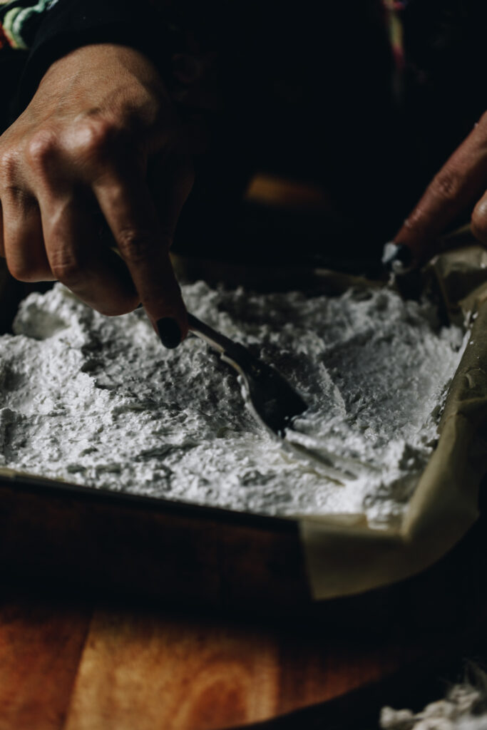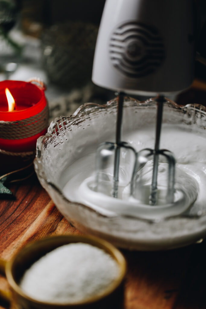 • Once it is ready, remove the heat and begin to whip on medium to high speed for 5 minutes or until you have reached stiff peaks.