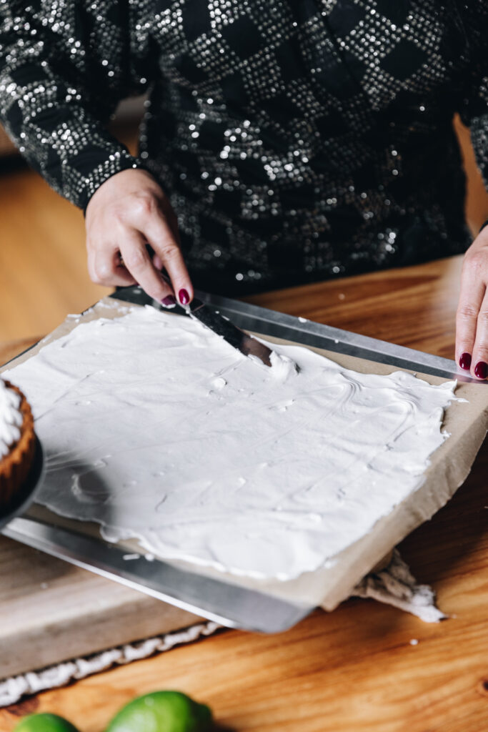 - Once the meringue is made, simple spread the meringue on to a flat tray lined with baking paper. If you are using half of the mixture (like I do for my lime pie) then spread the half mixture on to one tray. If you are using all of the meringue, then spread it on to two tray lined with baking paper.