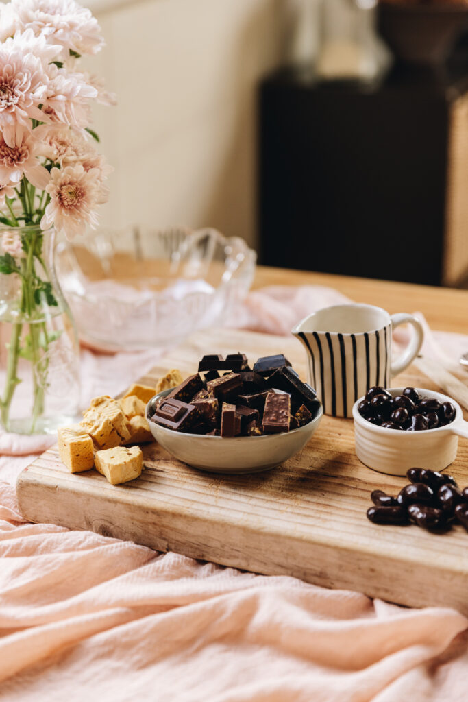 - ⅔ C honikoma me te pīnati tiakarete (hokey pokey and chocolate peanuts)