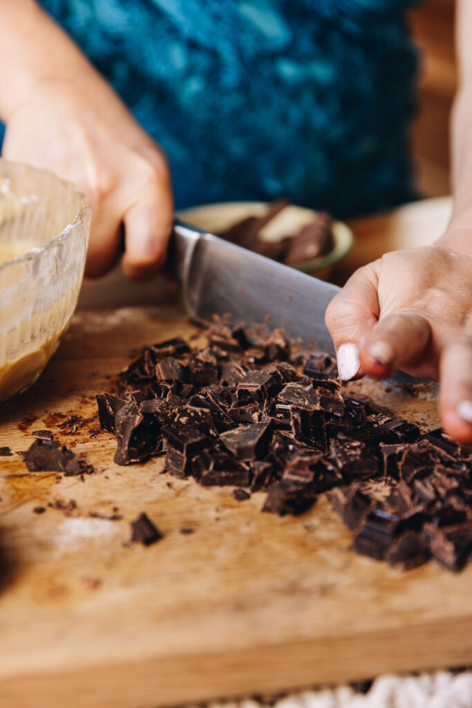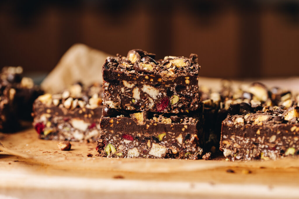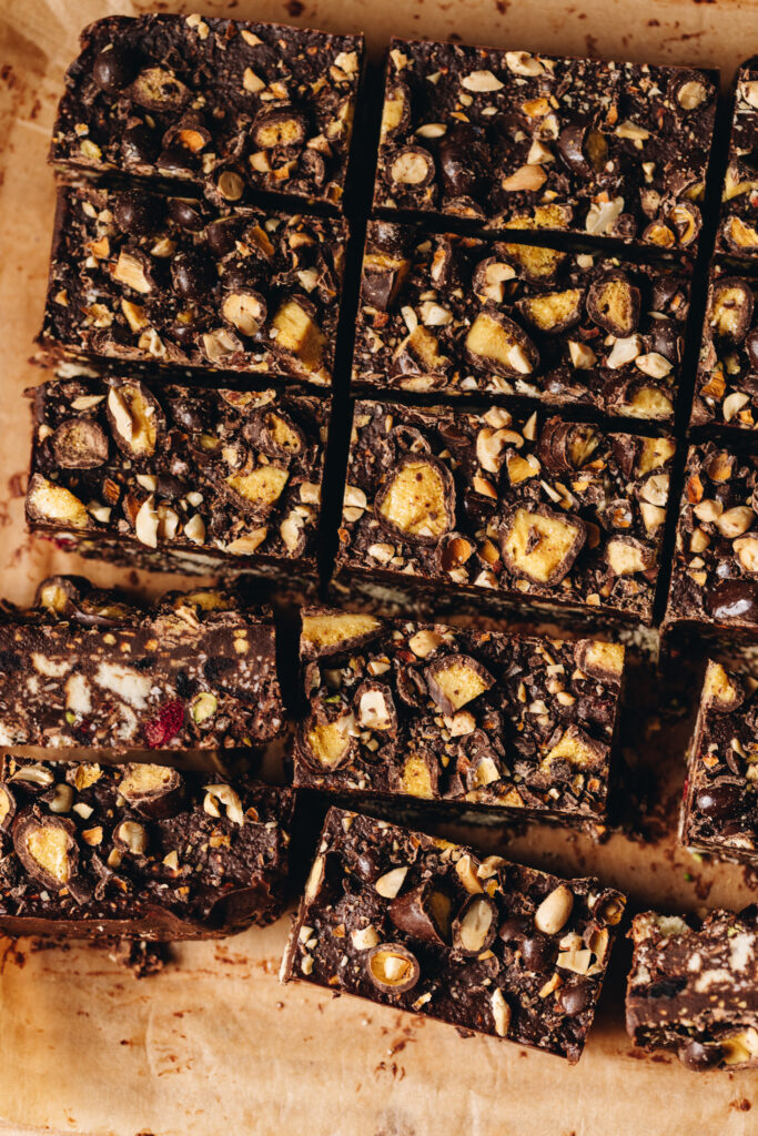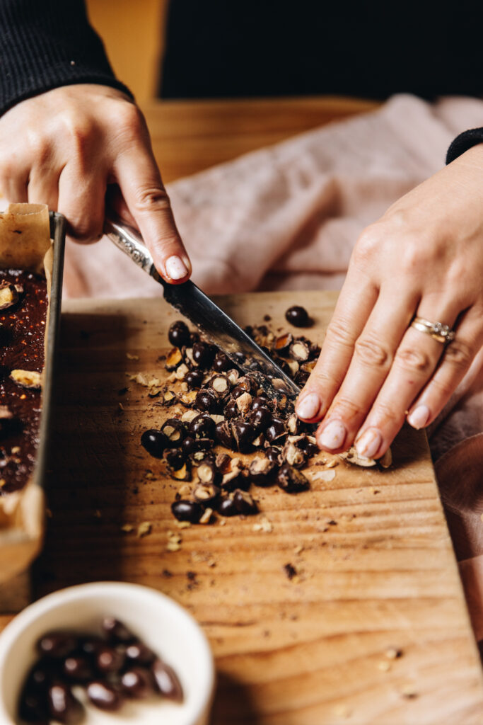 - Chop up the honikoma me ngā pīnati tiakarete (chocolate hokey pokey and peanuts) and add them on top of the unset ganache. Refridgerate for 30 minutes until firm and cut in to pieces.