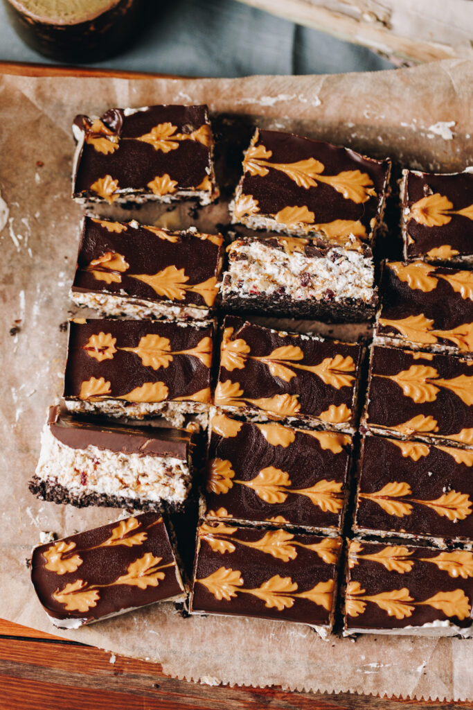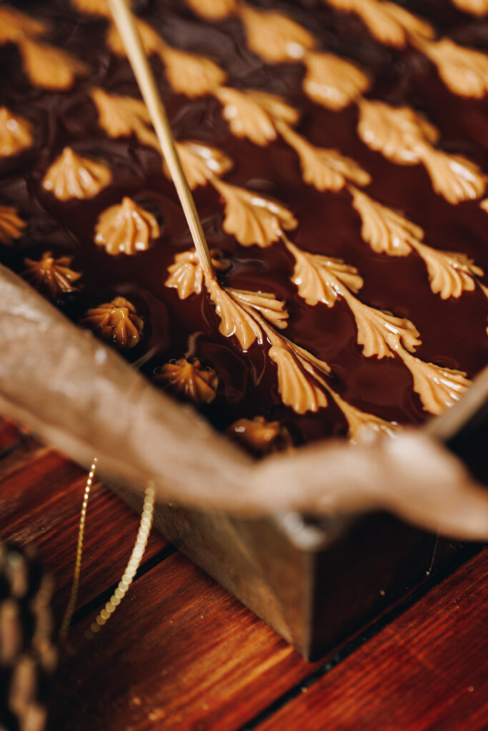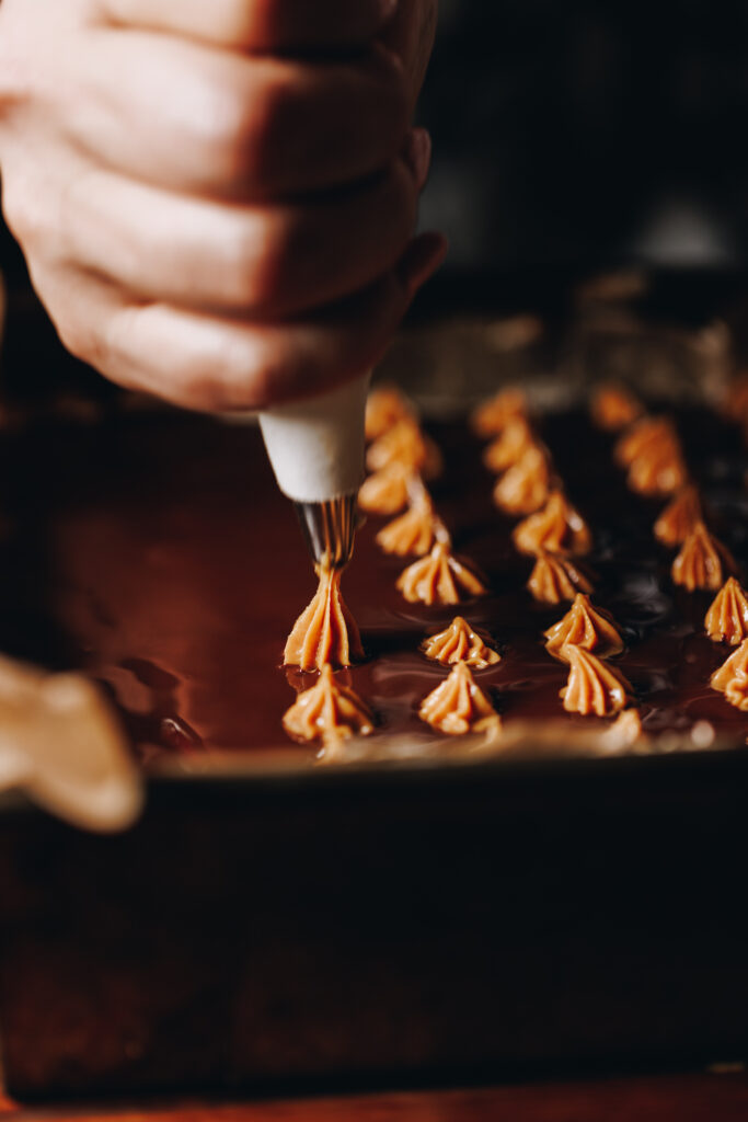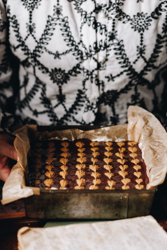 - Immediately (before the chocolate sets), pipe on the pata pīnati (peanut butter) in little lines all over the slice. It is easiest in a piping bag with a small star tip. Once you have added all the dots, gently drag a kebab stick through each one to get a simple design. Again, this is just an option you can leave it plain chocolate or sprinkle over chopped nuts or freeze dried fruit too. Set in the fridge for an hour or so.