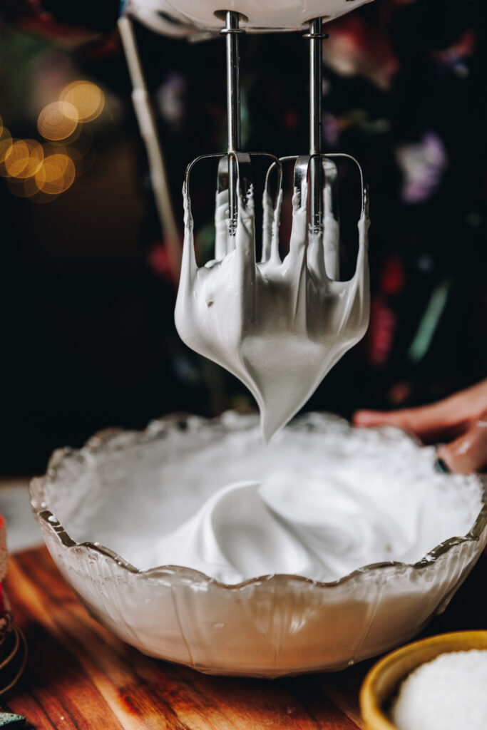 - Slowly pour the hot sugar syrup into the whipped meringue and whip on high for a minute or so. Then pour in the melted gelatine as you continue to whip for 5-7 minutes. Add in the wanira around the three minute mark. Stiff peaks should appear.