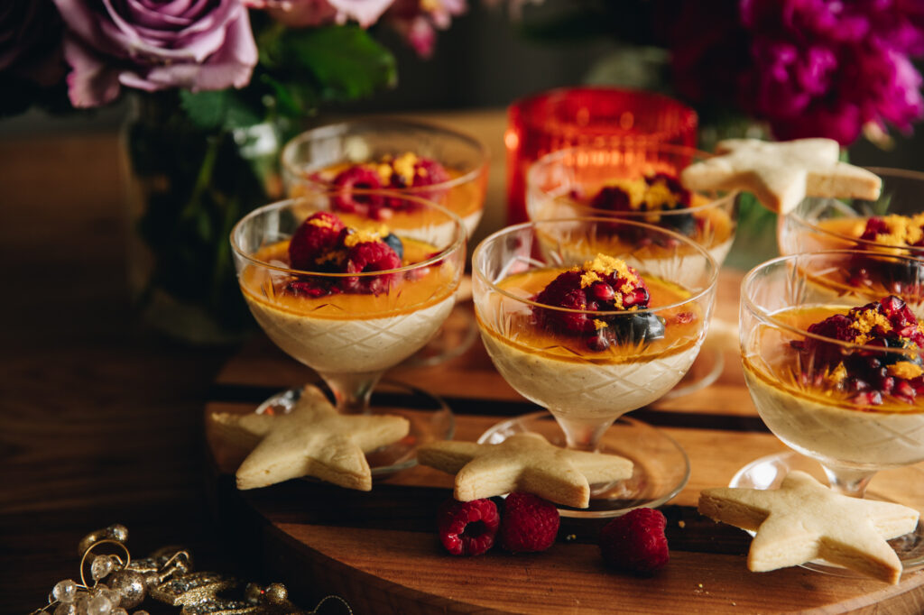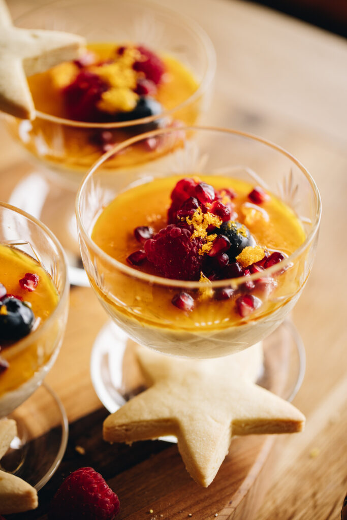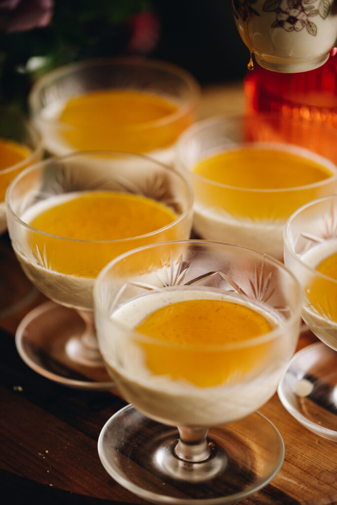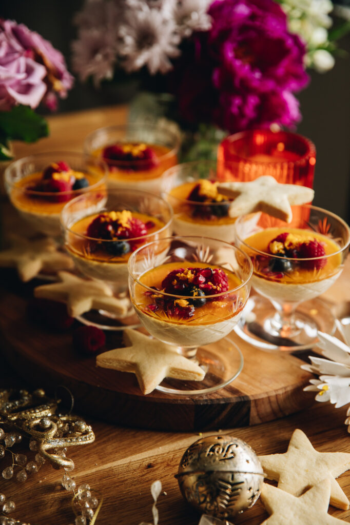 I set mine in second-hand glasses that I picked up for 50 cents each from the op shop and served them with my Christmas Shortbread Cookies. You can also set them in ramekins and tip them on to a plate before serving, using the wairanu manarini (mandarine syrup) as a drizzle instead. Kei a koe te tikanga – it is up to you!