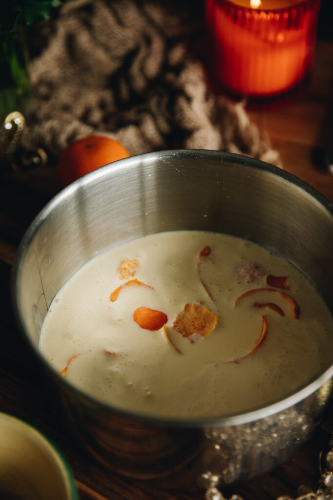 - With a sharp knife, peel the manarini (mandarins) or ārani (orange) in to the pot of kirīmi (cream). Make sure you avoid the white part of the peel, you just want the orange part of the skin. After the gelatine mixture has bloomed for 5 minutes, add it in too.