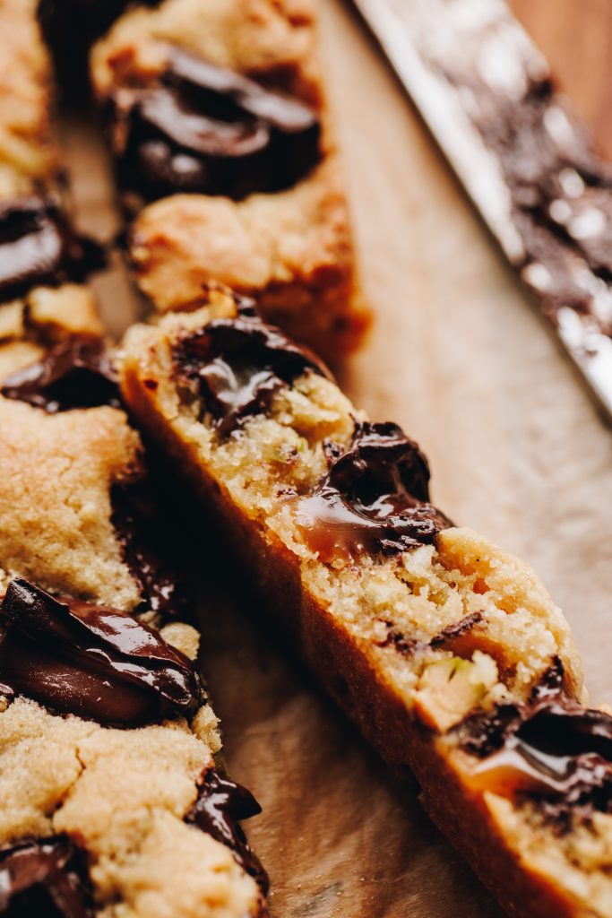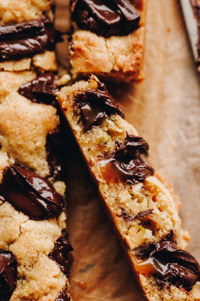 A sweet and salty cookie slice made with roasted pistachios, coconut and dark chocolate. A quick way to bake cookies but without the fuss of rolling.