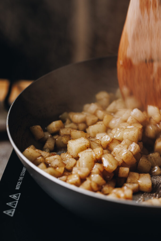 - Add the marahihi māpere (maple syrup). Stir it all together and keep cooking over low heat until the pea (pears) are caramelised.