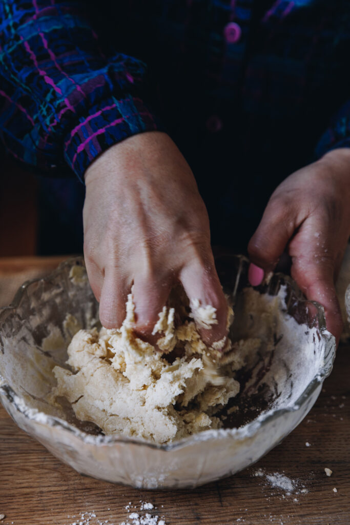 - Sprinkle a large piece of baking paper with flour. Roll the dough on to the baking paper until it is around 3mm thick.