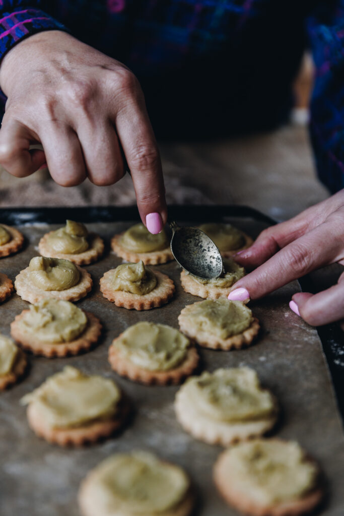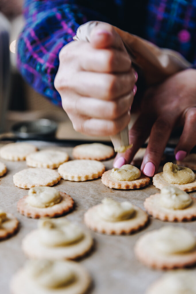 - Pipe or spread a blob on to each of the 25 cooled pihikete (biscuits). Make sure it doesn't spill too much over the sides of the biscuits.