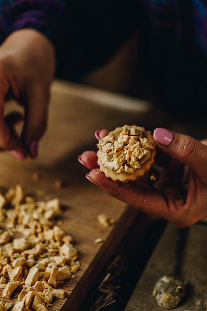 - Cut the honikoma into chunks and press in to butter filling on top of the biscuits. I like to press it it in to all of the butter mix to make it nice and high.