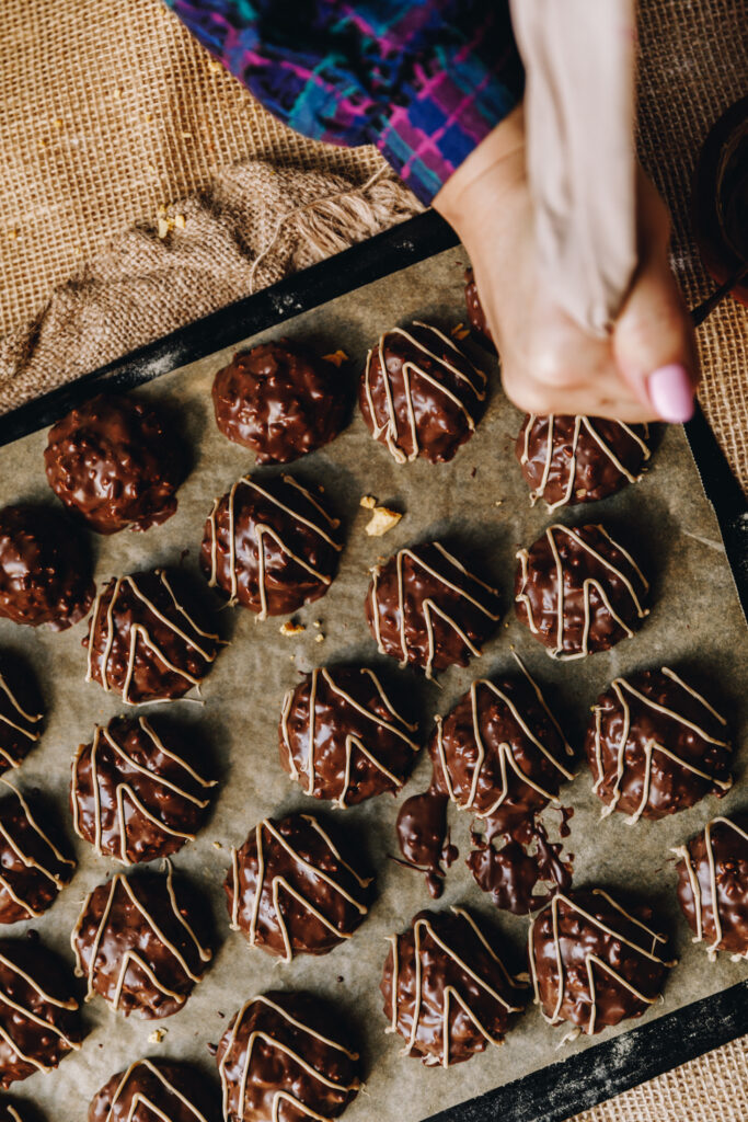 There are a few things to consider. Gently melt chocolate at all times, especially if you are coating something and want the chocolate to be beautiful once it is set. I am not one to temper my chocolate to a perfect temperature but I do like to gently melt it from room temperature in a heat proof boil that sits on a pot of barely simmering water. This gives the chocolate time to melt gently. Once it is 90 percent melted, remove from the heat and gently stir until the remaining chocolate is melted. It is now ready to use. When you are dipping the pihikete (biscuits), work quickly. Use a fork and a spoon. Use the fork for dipping the biscuit in to chocolate, scoop it up and give it a shake. Now use the spoon the drizzle the chocolate over the top. Give it a good shake to remove excess chocolate and gently remove the excess from the bottom of the biscuit. Then place on baking paper to set on the bench. I don’t like them to set in the fridge as the rapid change in temperature can often leave weird patches on the chocolate. Remember, don’t take it all too seriously. Baking is fun and a place to play!